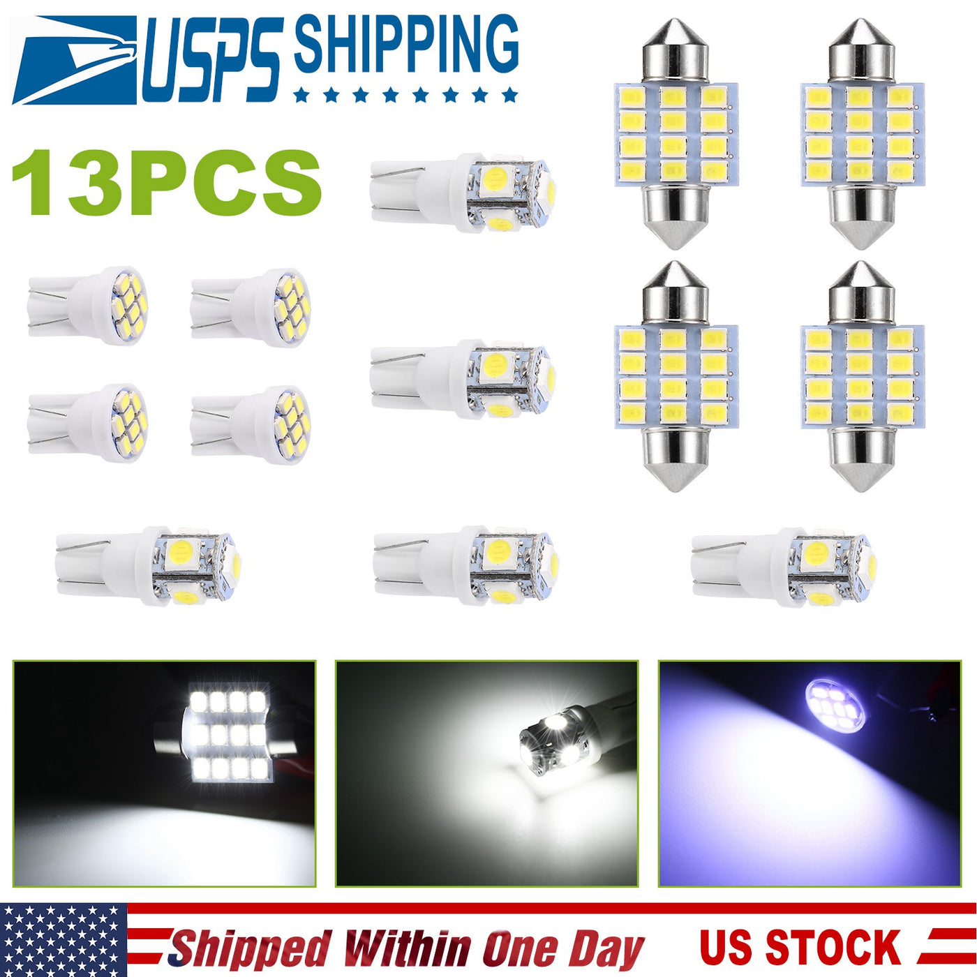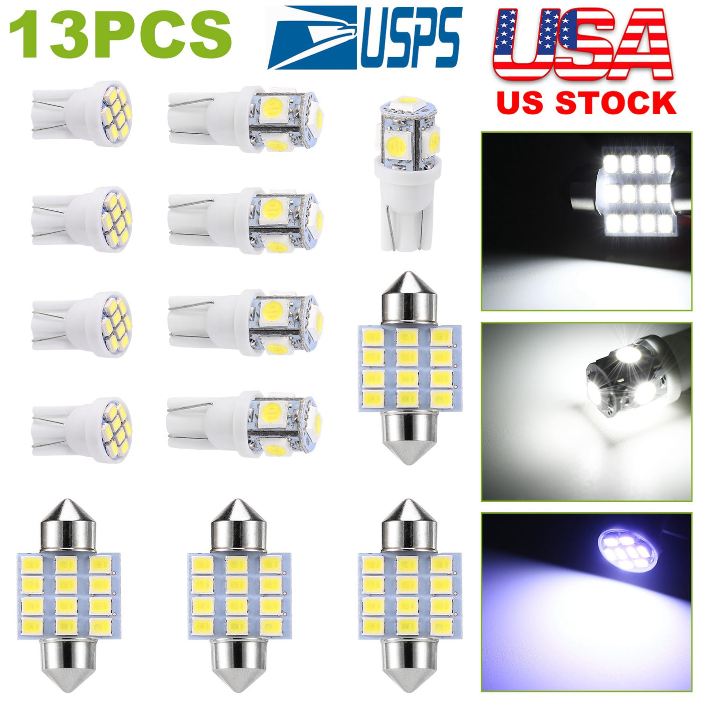 13Pcs T10 31mm Festoon LED Light Bulb Interior Dome Map LED Lights License Plate Trunk Side Positioning Lights 6000K White