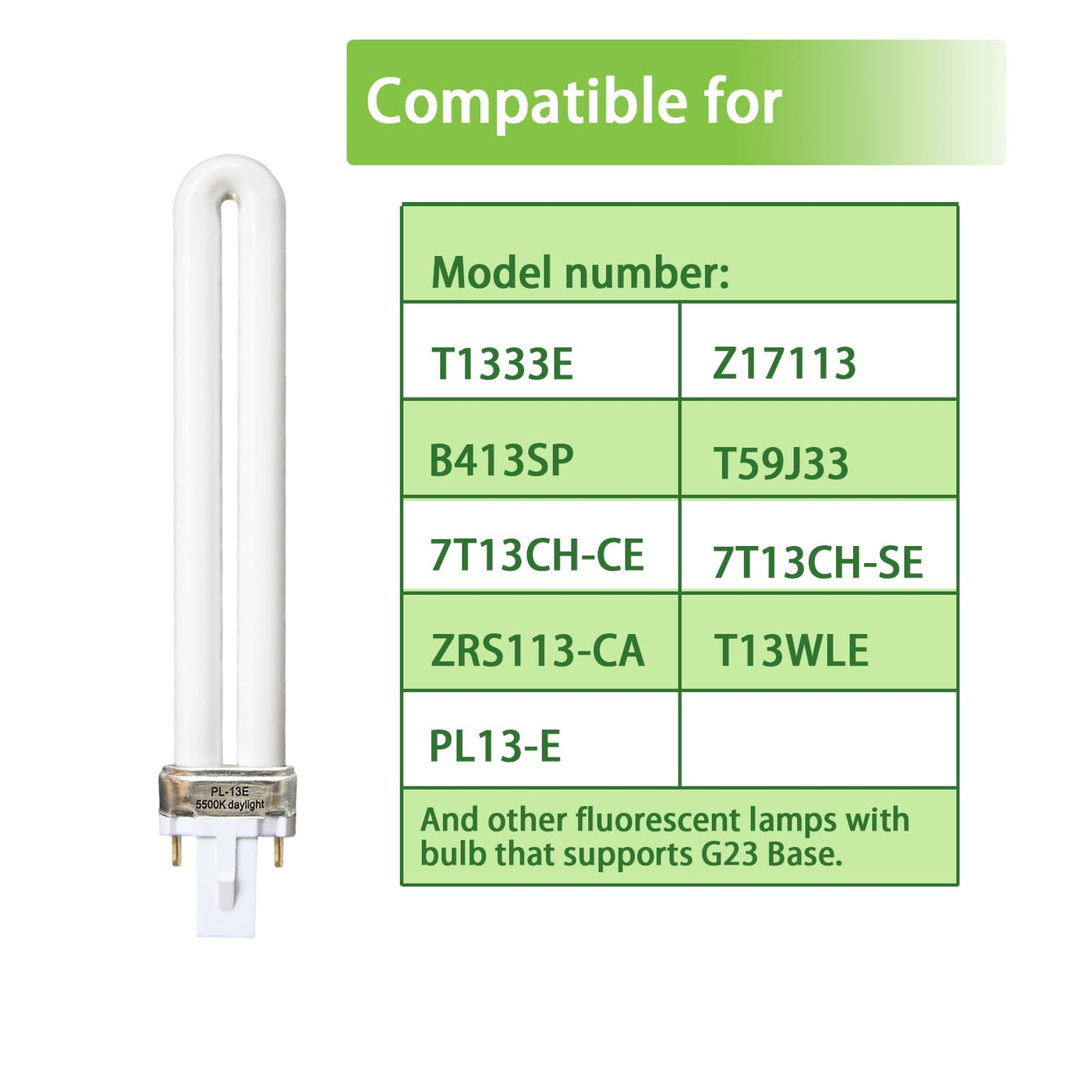 PL13-E-FFP 13W Replacement Light Bulb Compatible with Electronic Ballast Shape:T4 Wattage:13W Base Type: G23 Base Type: Fluorescent Bulb Color Temp: 5500K Natural Daylight Length: 7 inch Life Hours: 10,000,90 CRI