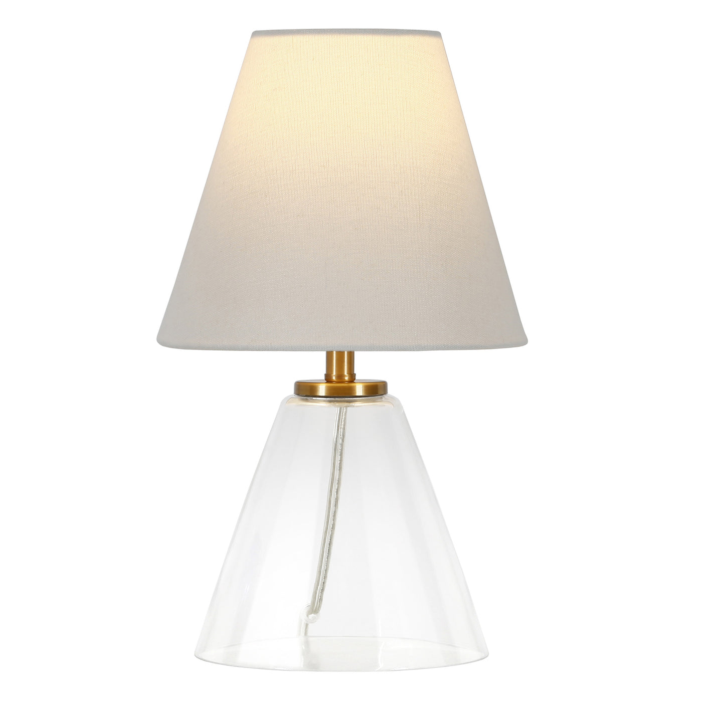 Embrace the good life with this hard working and stylish 14-inch clear glass geometric table lamp with white drum shade. The base of this lamp is made of clear glass. The white drum fabric shade is finishes this piece off nicely and symmetrically this standard table lamp is designed to provide general lighting to the area. The light that this lamp throws is soft and warm to elevate the look of most any space in your home. It is perfect for virtually any decor. 13.62-inch H x 8-inch W x 8-inch D