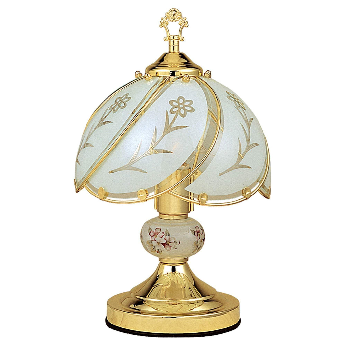 Add a bright anchor to your room with this 14-inch gold bedside table lamp with floral frosted glass shade. The gold and white shade has a novelty shape, includes a floral design element and is made of clear and white frosted glass, which makes it a perfect choice. Bedside table lamps help to add a soft and cozy glow to your bedroom. Great for evening reading. 14.25-inch H x 9-inch W x 9-inch DDetailsGTIN (UPC/EAN):606114542872Shipping Weight:6 PoundsShipping Size (Inches.): 9 W x 12 D x 9 H Number Of Cartons:1Shipping Method:ParcelShip from ZIP Code:90703Ship Palletized:NoItem Height:14.25 InchesItem Width:9 InchesItem Depth:9 InchesItem Weight:4 PoundsCountry of manufacturer:ChinaShipping Weight Carton 1:6Shipping Height Carton 1:9Shipping Width Carton 1:9Shipping Depth Carton 1:12Additional attributesBulbs RequiredYesBulbs ReplaceableYesBulb Type RequiredE-26Bulb Count1Bulb Maximum Wattage40Cord IncludedYesVoltage120Table Lamp TypeBedsideBase ColorGoldBase Metal TypeSteelWood TypeNot WoodNumber of Lights1DimmableYesDry, Damp or Wet Location ListedDryFixture MaterialMetalSwitch IncludedYesSwitch TypeTouchShade IncludedYesShade ColorGold and WhiteShade MaterialGlassShade Fitter TypeSlip UNOUL ListedYesShade Diameter9Lamp ShapeNoveltyLight ColorWarm WhiteKeywordstall touch table lamp brushed, tall touch table lamp, floral patterned glass shade, 25 tall touch table lamp, touch table lamp brushed goldBase MaterialMetalBulb baseE26/Medium (Standard)Set TypeSingleShade ShapeNoveltyCommercial UseYesRoomBedroomBulb Shape CodeA15Number of Lamps Included1SizeSmallShade PatternFlowersColorGoldStyleTraditionalAssembly RequiredPartial Assembly NeededBase FinishGoldSwitch LocationLamp BasePower SourcePlug-InBulb Not Included but RequiredYesPlug-InYes