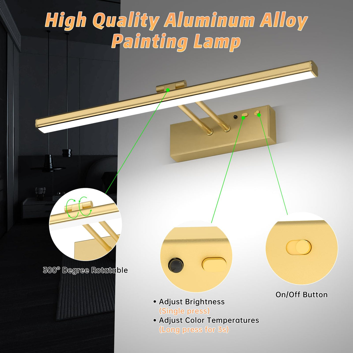 Q: Can I adjust the brightness and color temperature of the picture light?A: Yes, the picture light features adjustable brightness levels and three color temperatures: 3000k, 4500k, and 6500k. You can easily change these settings using the remote control or manual buttons, tailoring the light to enhance the ambiance of your artwork.