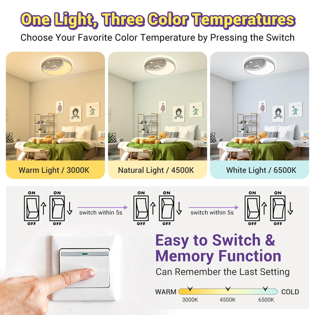 Q: What are the color temperature options for the 15.75 Inch Flush Mount Ceiling Light?A: The ceiling light offers three selectable color temperatures: 3000K for a warm atmosphere, 4500K for neutral white lighting, and 6500K for bright illumination, ideal for tasks such as homework.