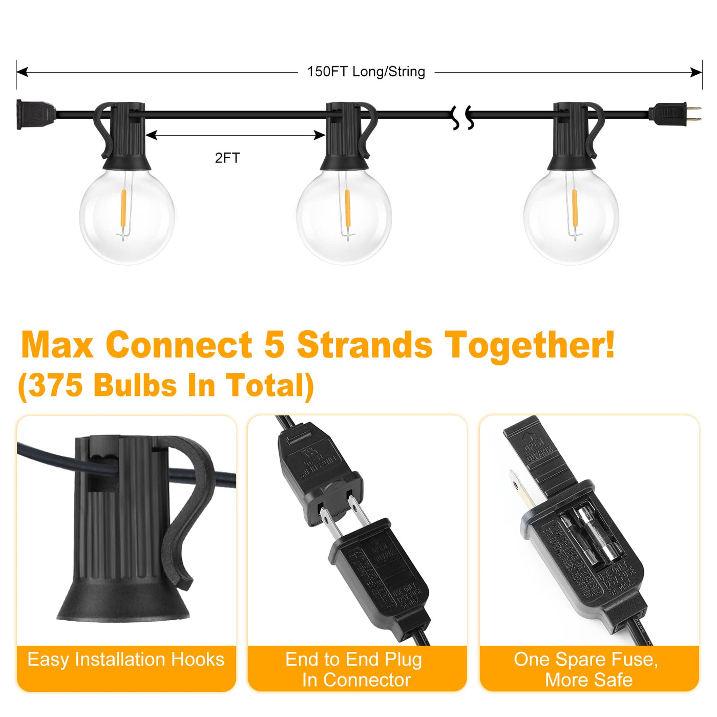 Q: What materials are the bulbs made from, and are they shatterproof?A: The bulbs of the 150FT G40 outdoor string lights are made from durable plastic, making them shatterproof and safe for use, unlike traditional glass bulbs that can break easily.