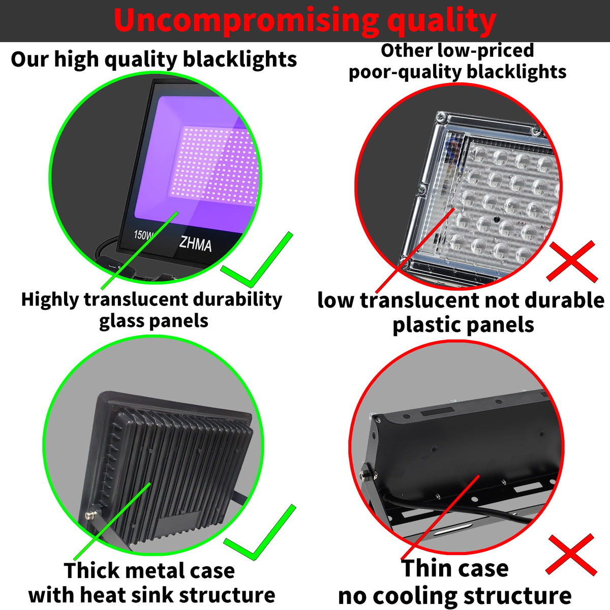 Q: What is the beam angle and light coverage of the 150W black lights?A: These black lights feature a wide beam angle of up to 120°, providing extensive coverage for large spaces. With 300 high-quality LED chips, they ensure bright and uniform lighting for any event or occasion.
