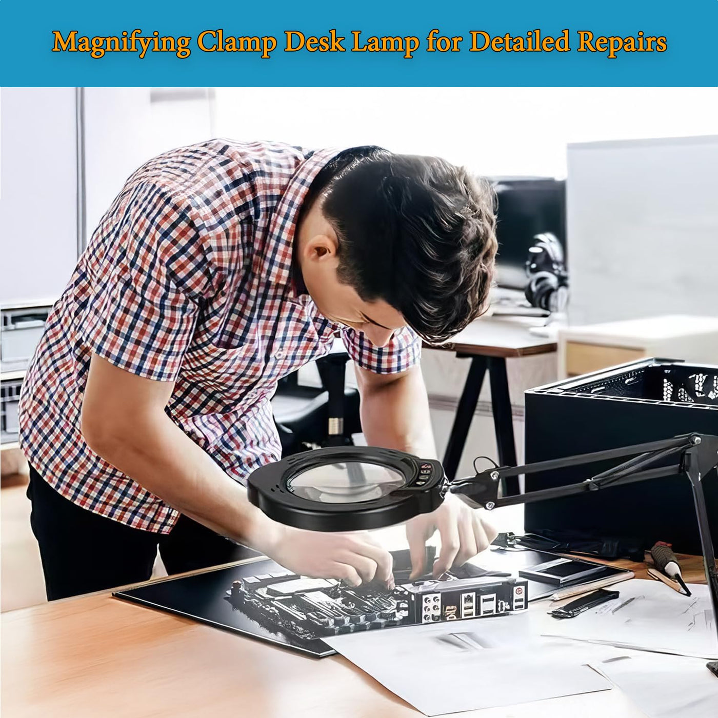 Enhance your reading, crafting, and close work with this versatile 15X magnifying glass desk lamp. Its flexible aluminum arms allow for 360-degree rotation, ensuring optimal positioning for your needs. The metal base provides sturdy support, while the 5 color modes and 10 levels of adjustable brightness cater to your preferred lighting environment. This eye-caring table lamp is an ideal companion for detailed tasks, offering magnified clarity and customizable illumination. Elevate your productivity and comfort with this thoughtfully designed magnifying lamp. Features: VERSATILE MAGNIFIER: Equipped with a 15X magnifying glass and flexible aluminum arms, this desk lamp is ideal for reading, crafting, close work, and other detailed tasks. ADJUSTABLE BRIGHTNESS: Customize the illumination to your needs with 10 brightness levels and 5 color modes (warm white, cool white, yellow, blue, and natural white). ERGONOMIC DESIGN: The 360 rotatable lamp head and adjustable arms allow you to position the magnifier and light at the perfect angle for comfortable viewing. STURDY BASE: Featuring a weighted metal base, the lamp remains stable and secure on your desk or workspace. DIMENSIONS: Lamp diameter - 6.3 inch, Glass Lens diameter - 4.2 inch. Package Included: 1 x 15X Magnifying Glass with Light 1 x Metal Base 1 x Clamp 1 x Connector 1 x User Manual