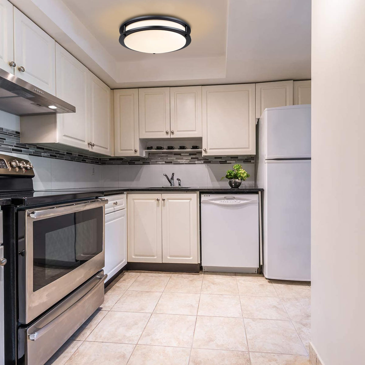 Q: Is this ceiling light suitable for damp locations?A: Yes, the Faymart 16 Inch Black Flush Mount Ceiling Light is crafted with rust-resistant materials, making it suitable for both dry and damp locations such as bathrooms, kitchens, and laundry rooms.