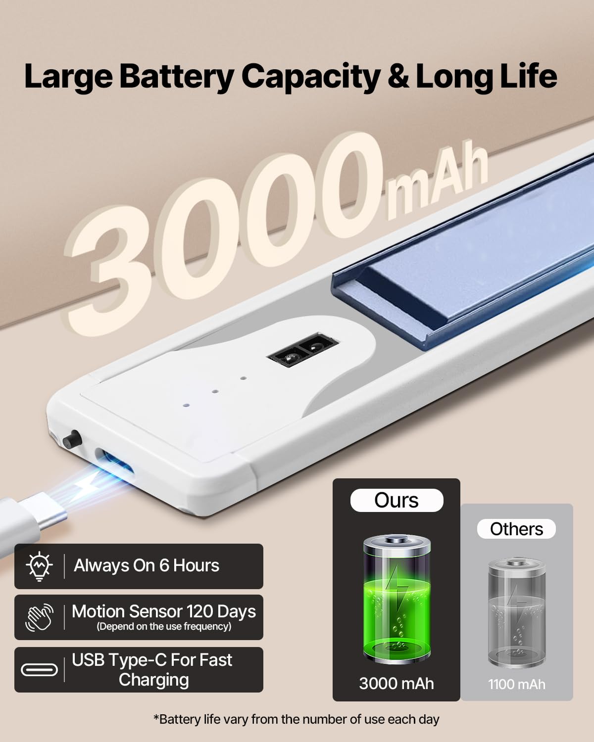Q: What is the maximum brightness duration of the light in Always-ON mode?A: In Always-ON mode, the under cabinet light can provide maximum brightness for up to 6 hours on a full charge, making it ideal for various applications where continuous lighting is needed.