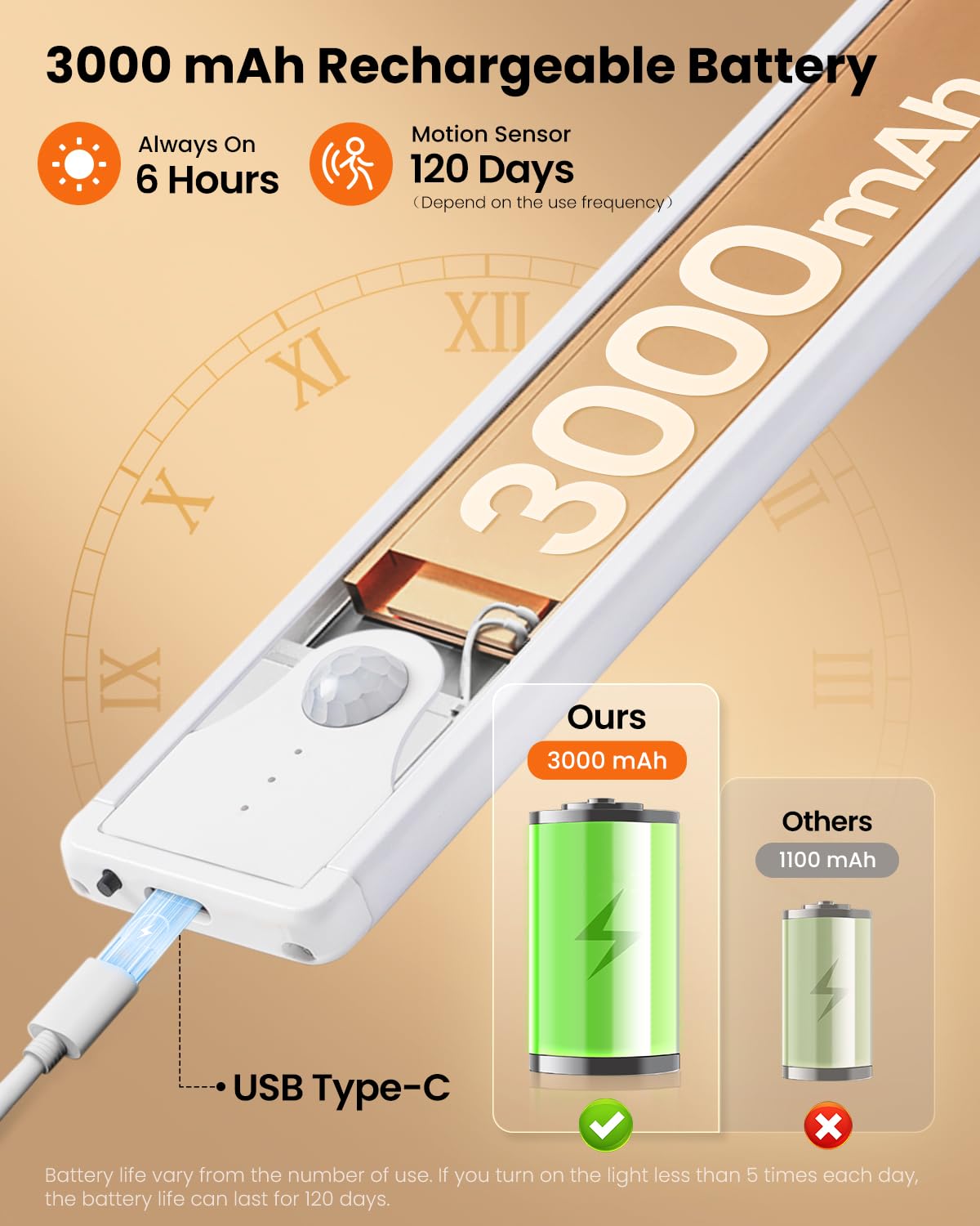 Q: How long does the battery last on a full charge?A: With a fully charged 3000 mAh battery, these lights can provide continuous lighting for up to 6 hours in Always-ON mode or last up to 120 days in motion sensing mode, depending on usage.