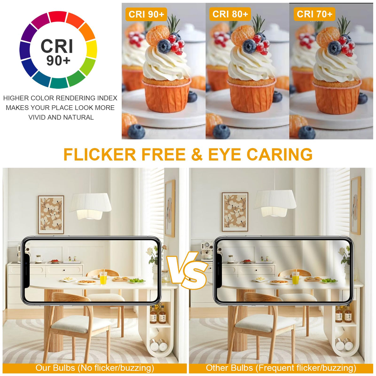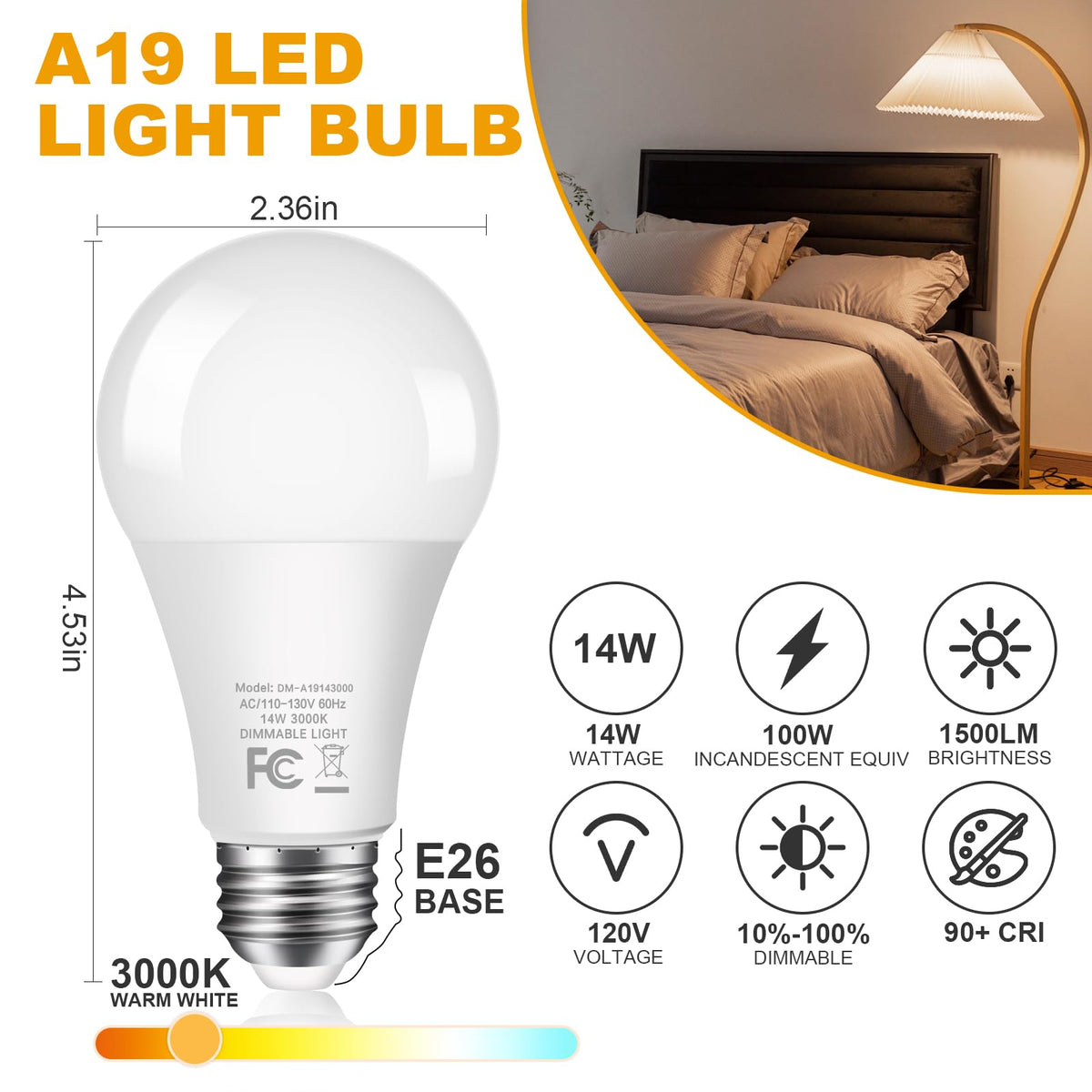 ???100W Equivalent LED Light?The advantage of using LED light is significant. It has a similar size of 100W traditional incandescent bulb but consumes only 14W to produce the same amount of brightness. Also the LED light has a lifespan as long as 25,000hrs, compared to merely 2,000hrs of traditional light. A big save on your energy bills and definitely a nice gesture to environment. | ???Dimmable LED Bulbs?Dimmable feature is a must-have if you want both a bright light and the flexibility to tone down the brightness. Conveniently our LED bulbs are dimmable and compatible with 90% dimmer models on the US market, allowing you to raise or dim down the brightness whenever you want. (Dimmer excluded) | ???A19 LED Light Bulbs with E26 Base?The LED bulbs feature a E26 screw base that easily fit into standard light bulb sockets without additional tools or complex wiring. The user-friendly installation process allows for quick and hassle-free bulb replacements. | ???3000K Warm White?The color temperature of the LED bulb is 3000K, a warm white light that makes your home cozy and welcoming. A perfect choice for pendant lights, chandeliers, table lamps, floor lamps, wall lights, and ceiling lights in bedroom, kitchen, living room, hallway etc.