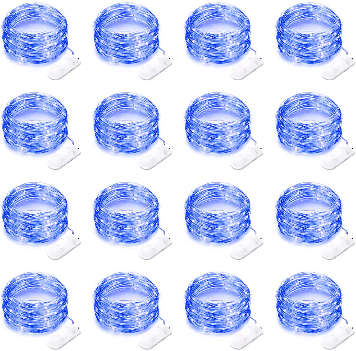 Q: How long are the 16 Pack Led Fairy Lights battery operated string lights?A: The 16 Pack Led Fairy Lights are each 10 feet long, providing ample length for various decorative uses.