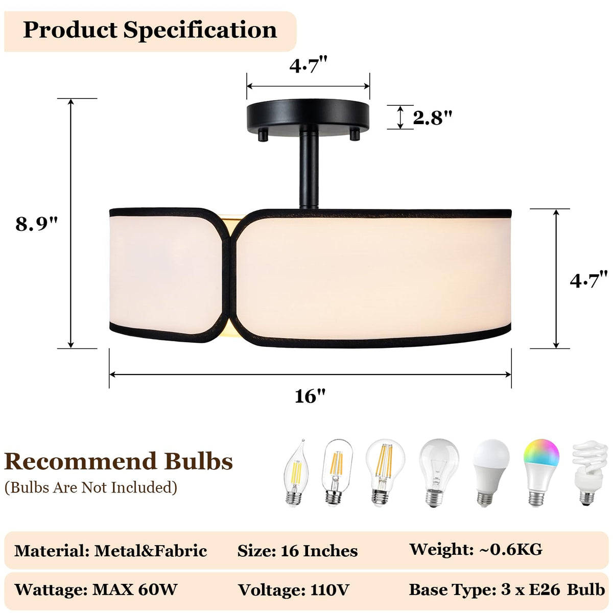 Q: What types of bulbs are compatible with the 16" Semi Flush Mount Ceiling Light?A: This ceiling light fixture is compatible with 3 x E26 base bulbs, which include LED, CFL, incandescent, and halogen options. You can customize the lighting by choosing different bulb styles and color temperatures, while also enjoying the dimmable feature when paired with a compatible dimmer switch.