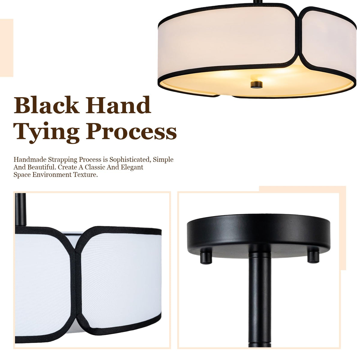 16'' Semi Flush Mount Ceiling Light - 3 Lights Drum Light Fixture With Black Border White Fabric Shade, Farmhouse Close To Ceili