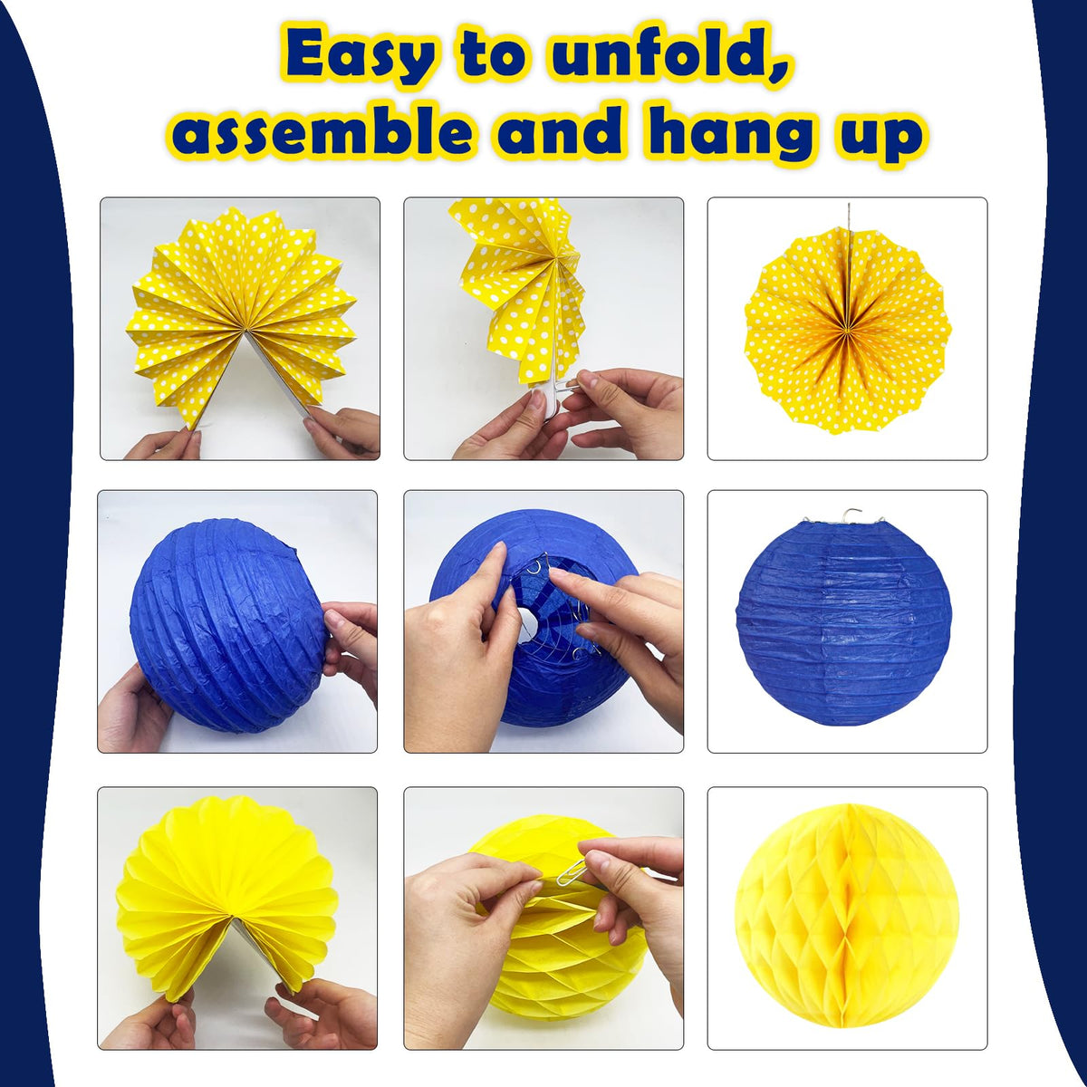 Complete Set: Includes 6 navy blue and 6 yellow paper fans in 3 sizes, plus 2 paper lanterns and 2 honeycomb lanterns, totaling 16 pieces.