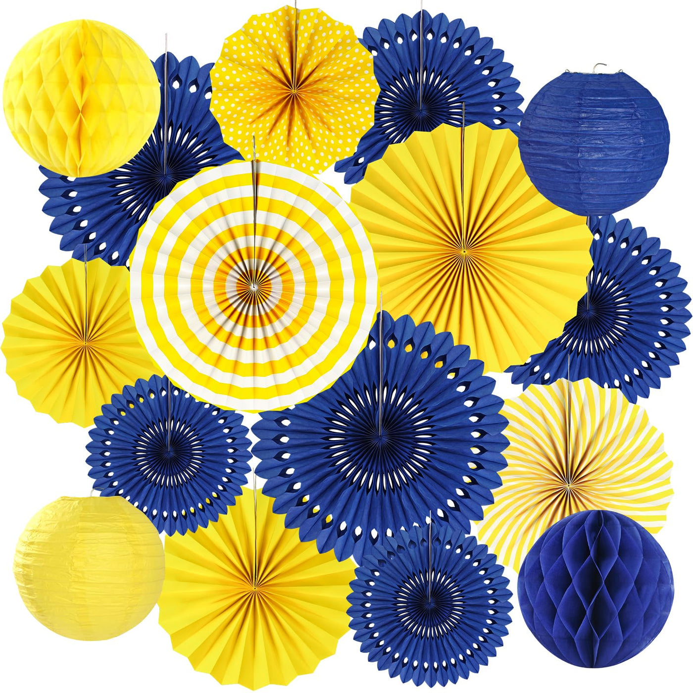Peywot 16Pcs Hanging Honeycomb Paper Fans & Lanterns, Blue and Yellow, Graduation/Birthday/Wedding Decor