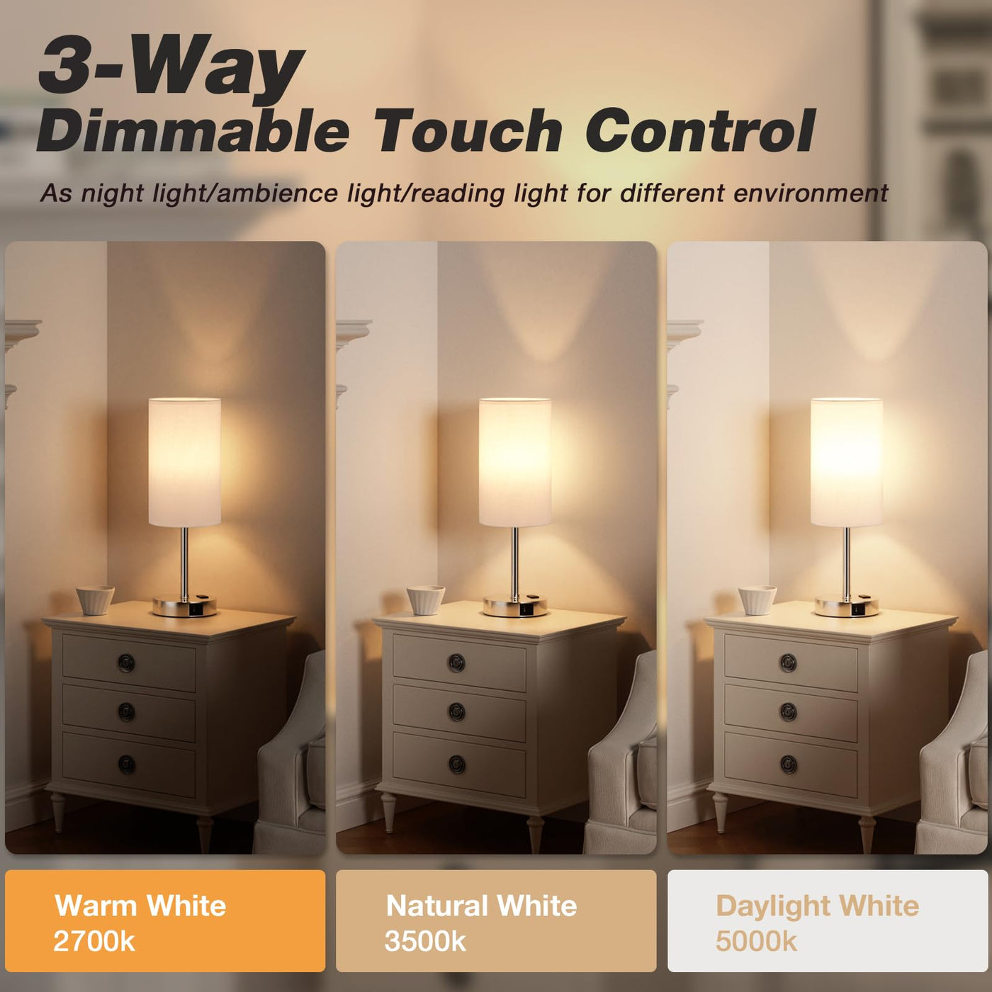 Q: How does the 3-way dimmable feature work?A: The lamp allows you to easily adjust the brightness by touching the base or lamp pole. You can choose from three brightness levels: 30% for a nightlight, 65% for reading, and full brightness for work or study.