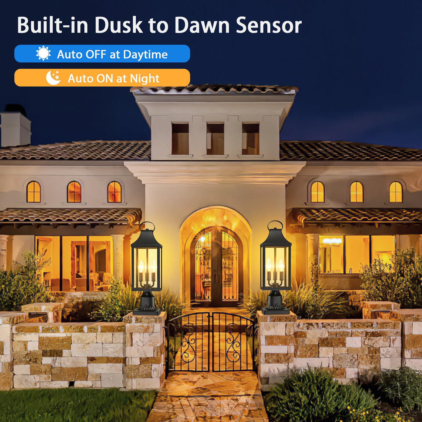 Q: How does the dusk to dawn sensor work on this post light?A: The built-in high sensitivity photocell sensor automatically turns the lamp post light off during the day when ambient brightness exceeds 100 lux and turns it on at night when brightness falls below 20 lux, providing convenience and energy efficiency.