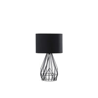 Q: What type of light bulb does the 18" Asymmetric Black Cage Metal Table Lamp require?A: This table lamp requires an E26 Type A bulb with a maximum wattage of 60 watts. It is compatible with incandescent, CFL, or LED bulbs.