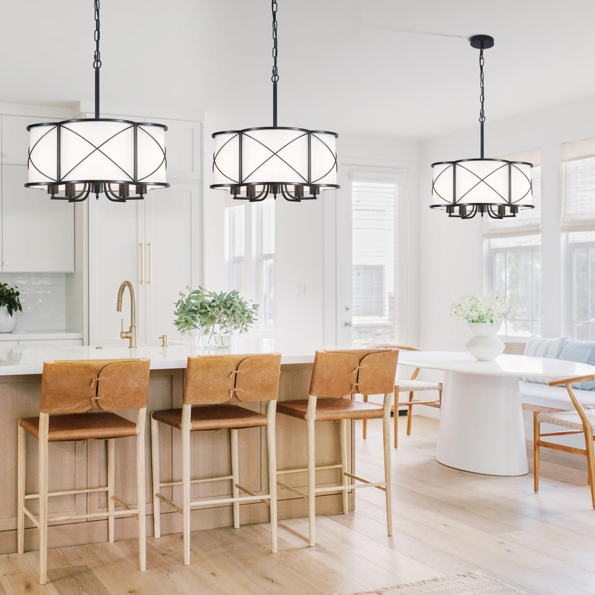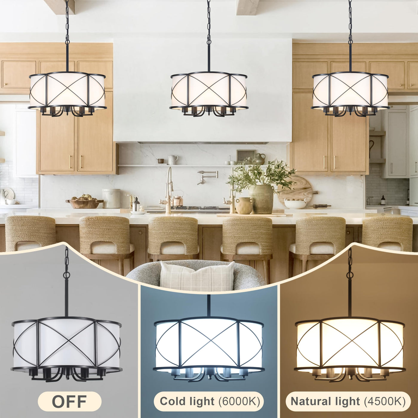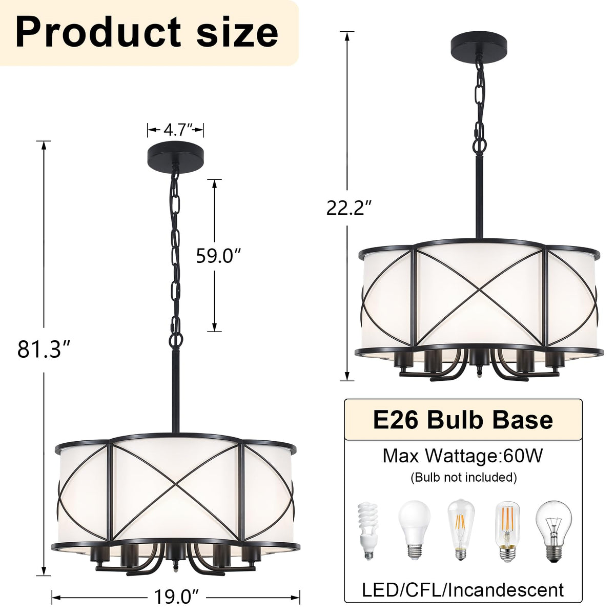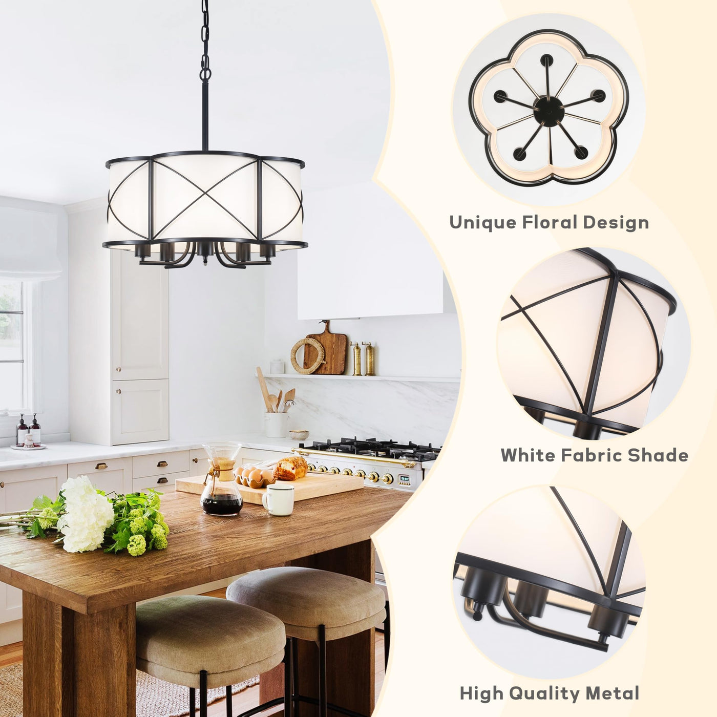 19'' Farmhouse Drum Chandelier For Dining Room 5-Light Black Modern Pendant Light White Fabric Retro Height Adjustable Lighting