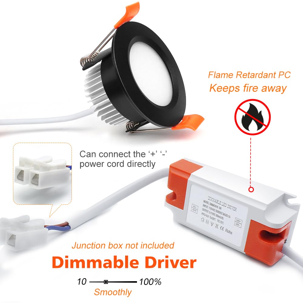 Widely Application : The Lovely Dimmable Recessed Down Lights Are Widely Used For Closets,Cabinet, Hallways, Bathrooms, Kitchens, Basements, Soffits, Porches, Garage Stairwells,Entry Ways,Corridors,Apartments,Nursing/Retirement Homes, Condos, Elevators,And Any Other Areas That You Want. Specification: Input Voltage: 110V Ac Wattage: 3W Dimmable: Yes Emitting Color: 2700K Daylight White/Pure White Brightness: 250Lm Material Type: Flame Retardant Pc + Aluminum Front Diameter: 2.75Inch/70Mm Cutout Opening Diamerter: 2.08 Inch/53Mm Height: 34.8Mm/1.37 Inch Package Includes: 20 X 3W Dimmable Led Ceiling Lights With Led Driver Please Pay Attention: If The Wire Color Is Blue, You Can Connect Them To ''L''''N'' At Will. If The Wire Color Is Red (Brown) And Black (Blue), That Means: Red (Brown): L, Live Line; Black (Blue): N, Null Line.
