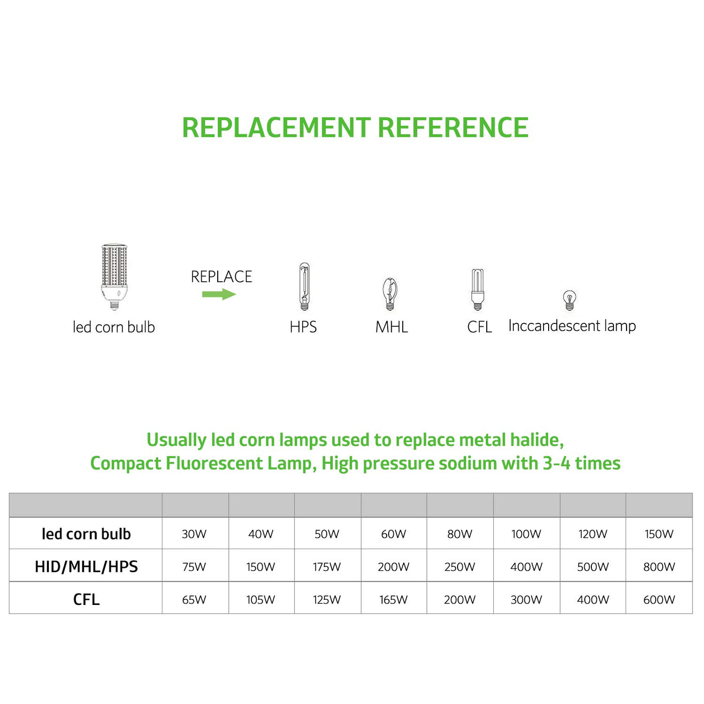 GTAREN Specializing in high-quality LED replacement products in the past decade, we have more than 40 products. In addition, with improved production equipment,we can independently produce LED radiator, LED power supply and LED lamp plastic parts The LED corn lamp certified by FCC can beused to replace 70W,100W,150W,175W, 200W, 250W, 320W, 400W and 600W 800w 1000w metal halide lamp (MHL),high intensity discharge bulb (HID), high pressure sodium bulb(HPS), incandescent bulb Compact Fluorescent bulb(CFL ) perfectly. Besides, LED corn Bulb is widely used in outdoor lighting , warehouse lighting , street lighting, high-bay & low-bay LED lighting LED flood lighting, industrial spaces lighting,garage lighting,commercial lighting,shopping lighting and parking lot lighting,factory lighting,wall pack lighting,area lighting,driveway lighting,post top lighting,barn lighting,patio lighting,courtyard lighting,garden lighting,canopy lighting projects and so on. It not only has strong lightness, but alsois high-efficiency. In addition, we provide five-year warranty With it,let us do energy conservation together Specification: CRI: >80 PF: >0.9 THD: <20% Wattage: 100W Lumen Efficacy:135lm/w. LED Lamp:SMD2835LED Brightness:13500Lm Color Temperature: 5000 Kelvin LED Qty:496pcsSMD2835 Socket: E26/E39 Waterproof: IP60 EmittingAngle:360 degrees NOTICE: ? Make sure to remove or bypass the ballast in the fixtures before installing. Don't need ballast, just wire them directly. ? Suitable for use in enclosed luminaires, Please CONFIRM the installation size ? The input voltage and lamps should be matched(AC110V-277V) ? Suitable for damp locations(Do not use withdimmers) In the Box: GTAREN LED Corn Light+E39 or E26 Adapter