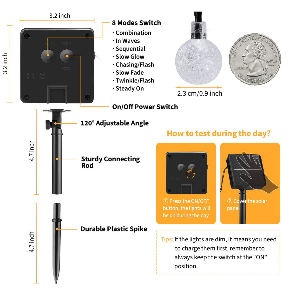Energy saving led lights: 2 pack 35.6ft long string with 60 super bright led bulbs, powered by solar energy, can save electricity and money which enable your life to practice the concept of sustainable development and improve the quality of life. It can still be touched safely after it has been working for some time, which is a friendly product Multifunctional 8 lighting modes: Beautiful and brilliant lighting modes include waves, combination, sequential, gradual, chasing/flash, slow fade, twinkle/flash and steady on. 8 lighting modes can meet all your requirements for different lights Widely used: These outdoor balcony lights are the perfect decoration for terrace, pergola, bistro, backyard, deck, barbecue, umbrella, dinner, birthday, Christmas, New Year party and more. Please contact the seller directly if you have any quality problems