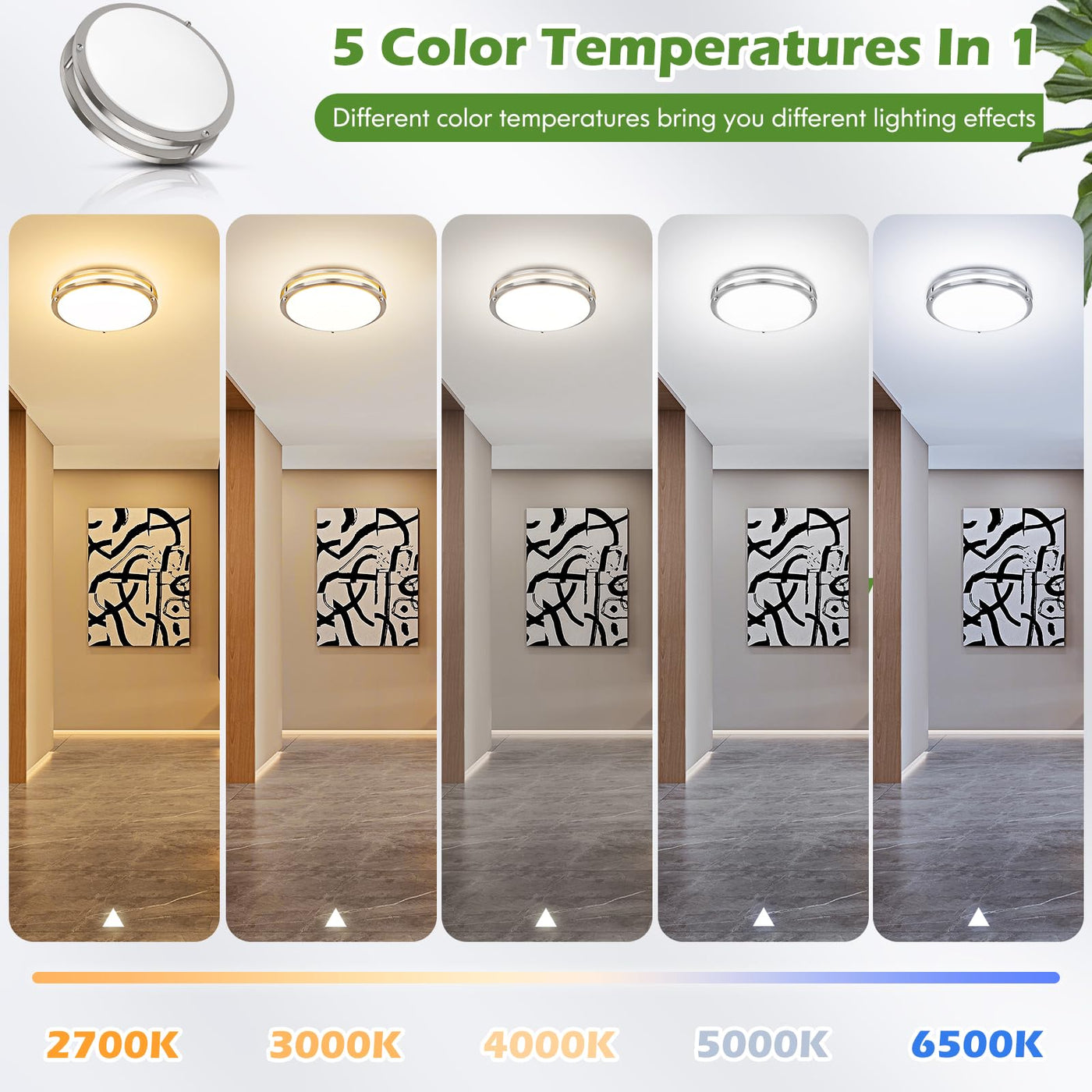 Q: What are the color temperature options for the 2-Pack 13 inch Dimmable LED Ceiling Light Fixture?A: The 2-Pack 13 inch Dimmable LED Ceiling Light Fixture offers 5 adjustable color temperatures: 2700K (yellow warm), 3000K (soft white), 4000K (neutral white), 5000K (daylight), and 6500K (ultra-bright). This allows you to customize the lighting to suit different moods and settings.