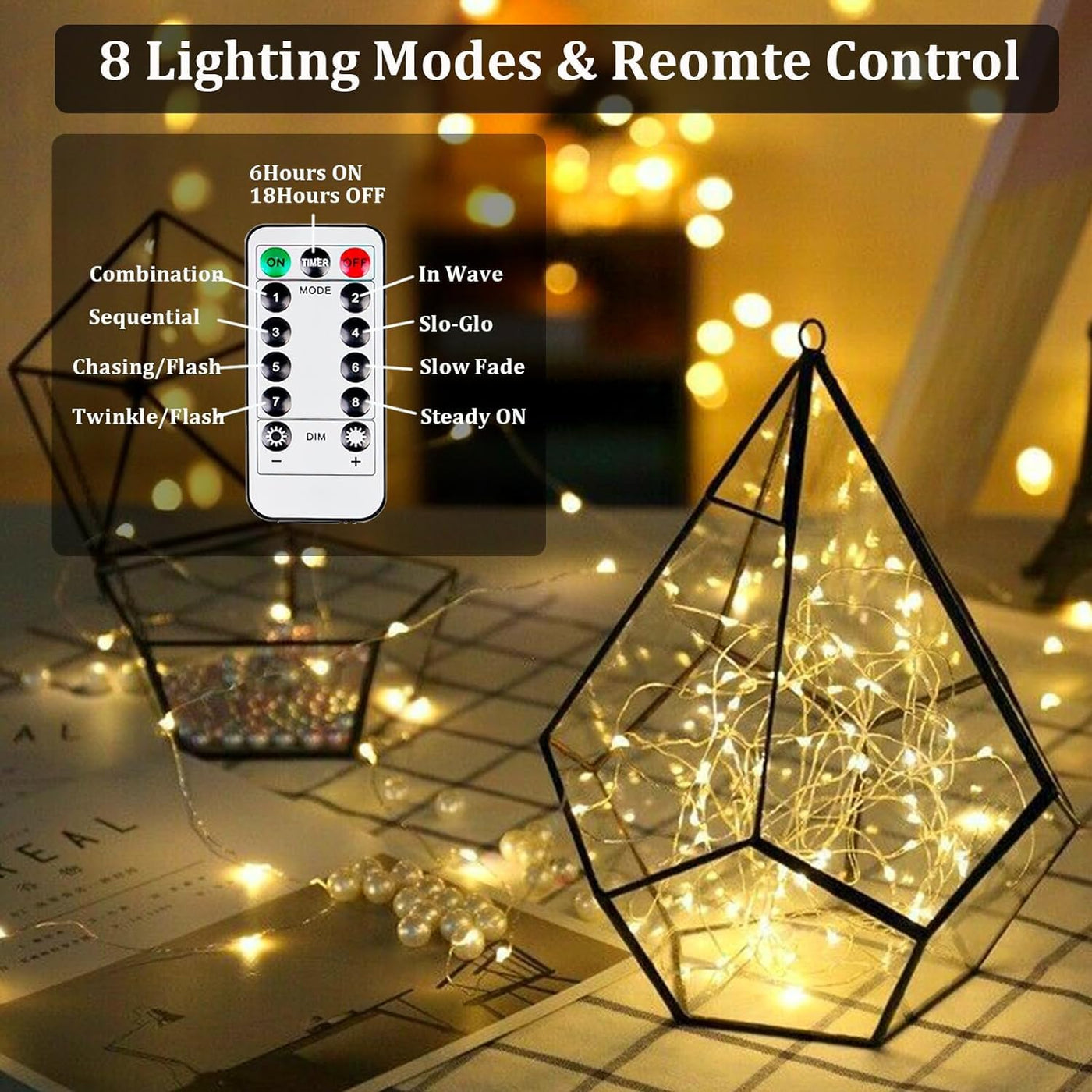 Q: What lighting modes are available with the remote control?A: The remote control allows you to choose from eight different lighting modes, adjust brightness levels, and set a timer for six hours on and eighteen hours off, catering to your mood and decorating needs.