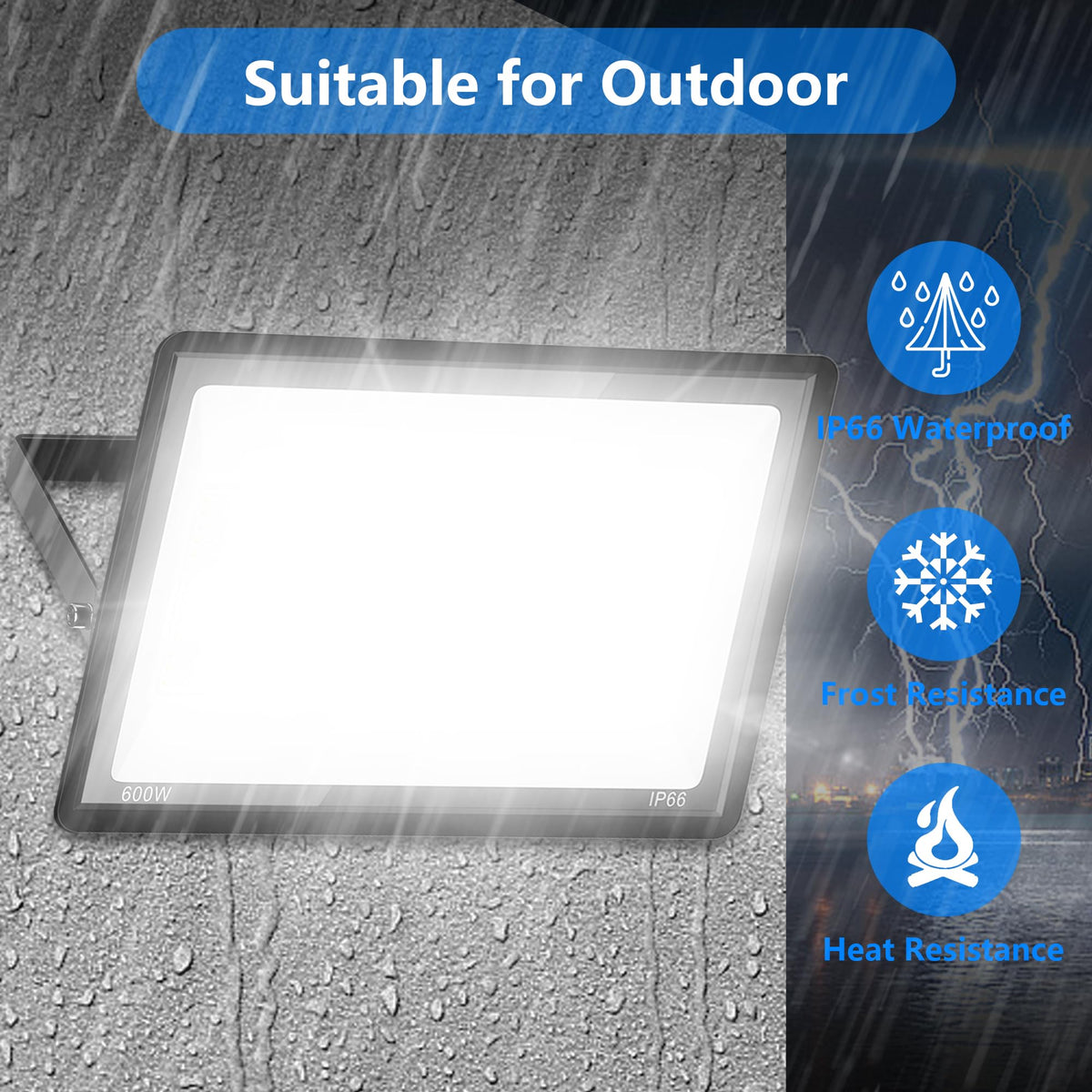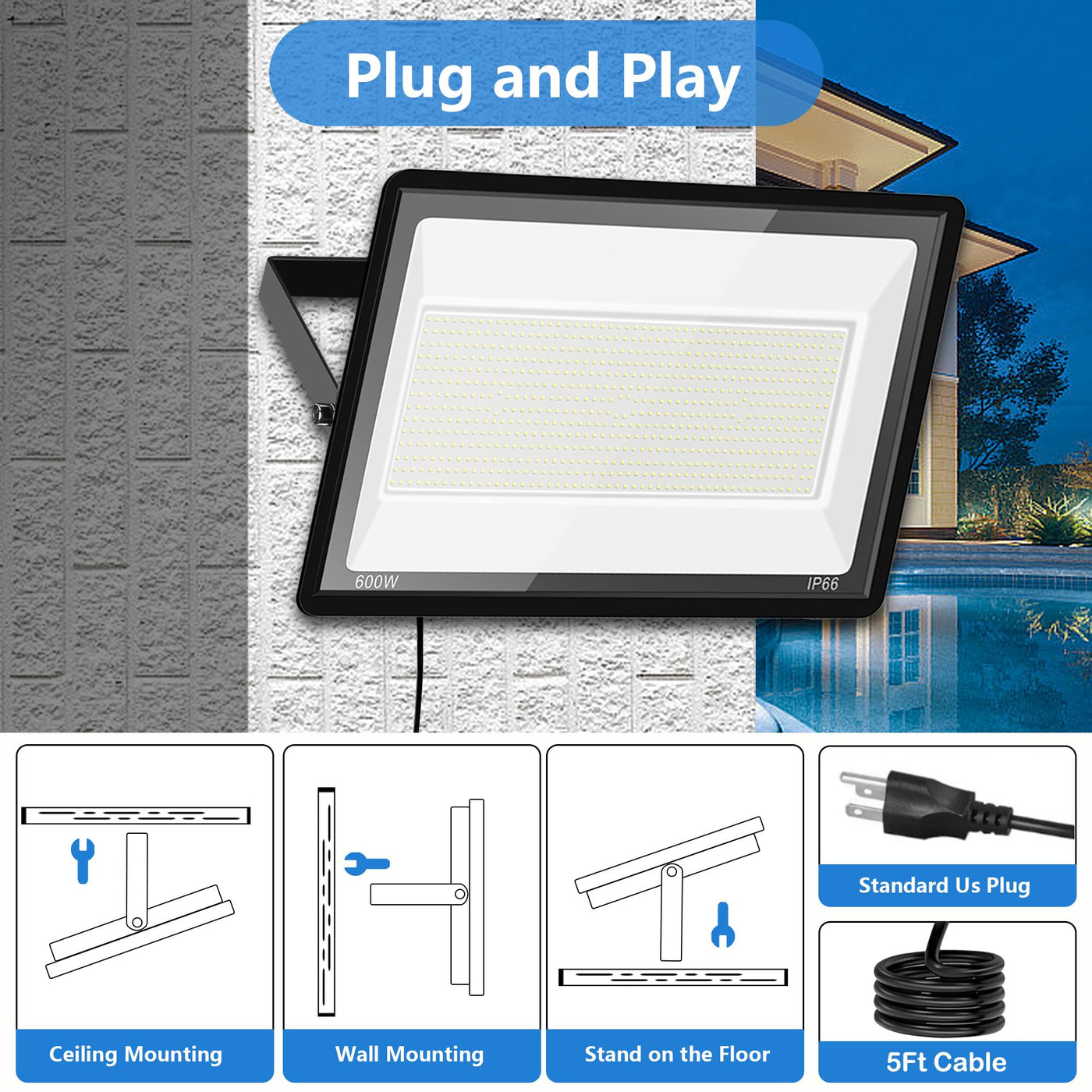 Specification Wattage: 600W Led Type: Epistar Leds Luminous Efficiency: 140Lm/W Total Lumens: 66 000Lm Color Temperature: 6000K Daylight White Power Factor: =0.95 Cri: >85Ra Input Voltage: Ac85-265V Ip Rating: Ip66 Waterproof Material: Die-Cast Aluminum + Tempered Glass Cable Length: 5Ft (With Us Standard Plug) Beam Angle: 120 Lifespan: >50 000 Hours Installation: Adjustable Bracket For Wall/Ceiling/Ground Mounting Its Rugged Die-Cast Aluminum Construction Ensures Durability With A Specially Engineered Fin-Type Heat Sink That Allows For Exceptional Thermal Dissipation. Whether YouRe Facing Heat Rain Or Snow This Floodlight Keeps Shining Thanks To Its Ip66 Waterproof Rating And Anti-Corrosion Coating. Designed With A 5-Foot Power Cord And An Adjustable Bracket For Easy And Stable Installation On Ceilings Walls Poles Or The Ground-This Light Suits Every Commercial Or Residential Application. ItS A Smart Choice For Large-Scale Lighting Projects Where Brightness Reliability And Efficiency Are Top Priorities.