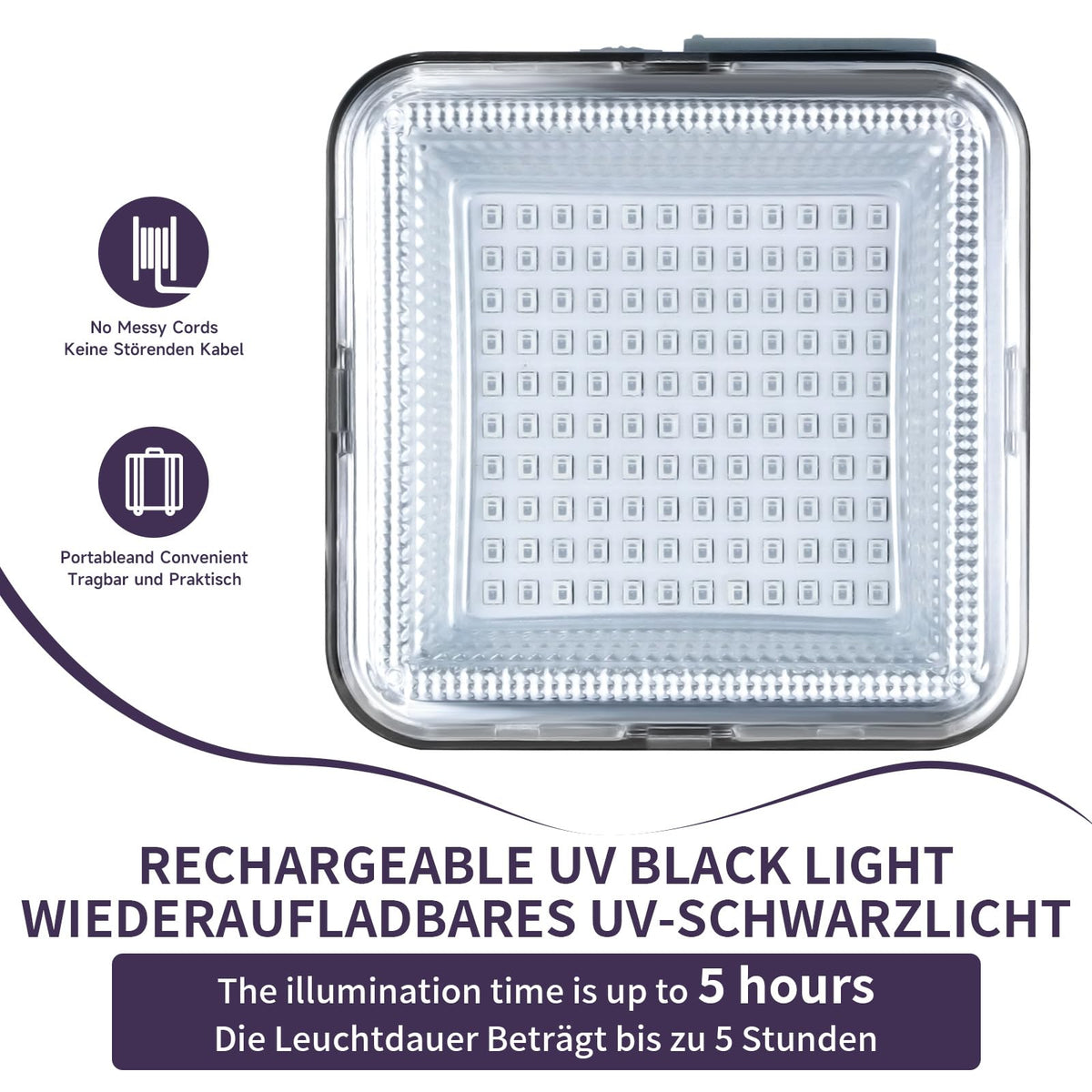 Q: How long does the battery last on a single charge?A: The rechargeable black light can last approximately 5 hours on high brightness and up to 8-10 hours on low brightness with a fully charged 2400mAh battery.