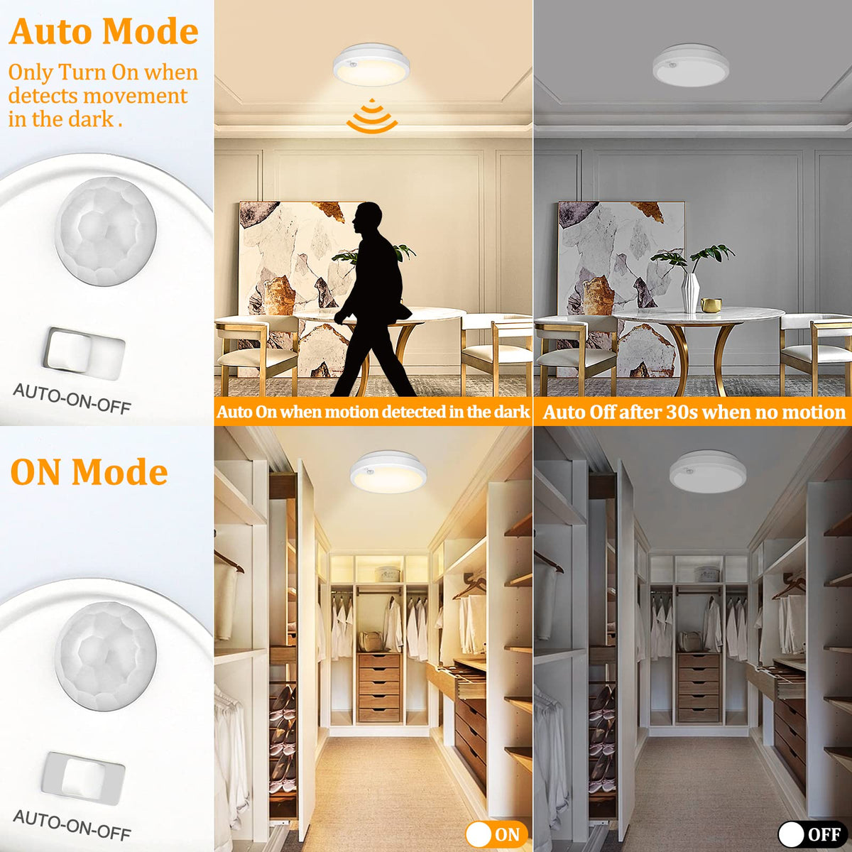 Brightever Practical 2-Pack Motion Sensor Ceiling Lights Battery Operatedwhy Choose Us?We Brightever Together New Ideas And Advanced Technology, We Have Been Designed And Manufactured Decorative&Functional Lighting For International Market For 10+ Years, And Remain As Close To Our Core Values As We Ever Have: Premium Materials, Updated Function, Unique Design And Satisfying Experience.Upgrade Pir Motion Sensor & Various Modes Availablebrightever Led Ceiling Lights Are Built With Advanced Motion Sensor, These Ceiling Lamps Are Motion Activated And Equipped With Large Motion Detection Range Up To 3-5 Meters(9.84-16.4 Feet).Built With Two Modes (Auto/On), You Can Choose The Suitable Mode For Your House. For ?Nmode, Our Flush Mount Ceiling Light Will Keep On No Matter It? Day Or Night. For Auto Mode, These Wireless Flush Mounts Light Will Only Be Activated When Detect Movement In The Dark.Cost-Effective Battery Poweredour Motion Sensor Ceiling Light Is Operated By 6*No.5 Batteries(Not Included, 12 Batteries In Total). Using Energy-Saving And Convenient Design To Make The Great Light, Glowing 3000K Warm Soft White Light In 400Lm With 80 Led And Soft Frosted Plate.Wireless & Easy Installationconstructed With Wireless Design, These Flush Mount Light Fixtures Are Super Easy And Safe For Any Ages To Install And Use. Saving The Hassle Of Hiring An Electrician To Dig Trenches That You Can Install This Motion Sensor Ceiling Light Within 5 Minutes.Package Listslamps * 2Installation Kits * 2Instruction * 1Faq:Q1: Do Seller Cover Warranty For These Lamps?A1: Yes, We Brightever Will Offer 1-Year Warranty For These Ceiling Lights, If There Is Any Issue, Please Feel Free To Contact.Q2: Why The Lights Do Not Work When Set In Auto Mode?A2: Please Note That These Lights Will Only Turn On When Detects Movement In The Dark.