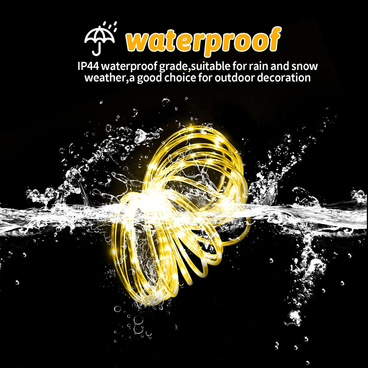 Q: Can the rope lights be used outdoors during all weather conditions?A: The rope lights are designed with an IP44 waterproof rating, which means they can withstand light rain and splashes. However, the battery box is not fully waterproof, so it should not be immersed in water. Regular maintenance is advised to prevent rusting.