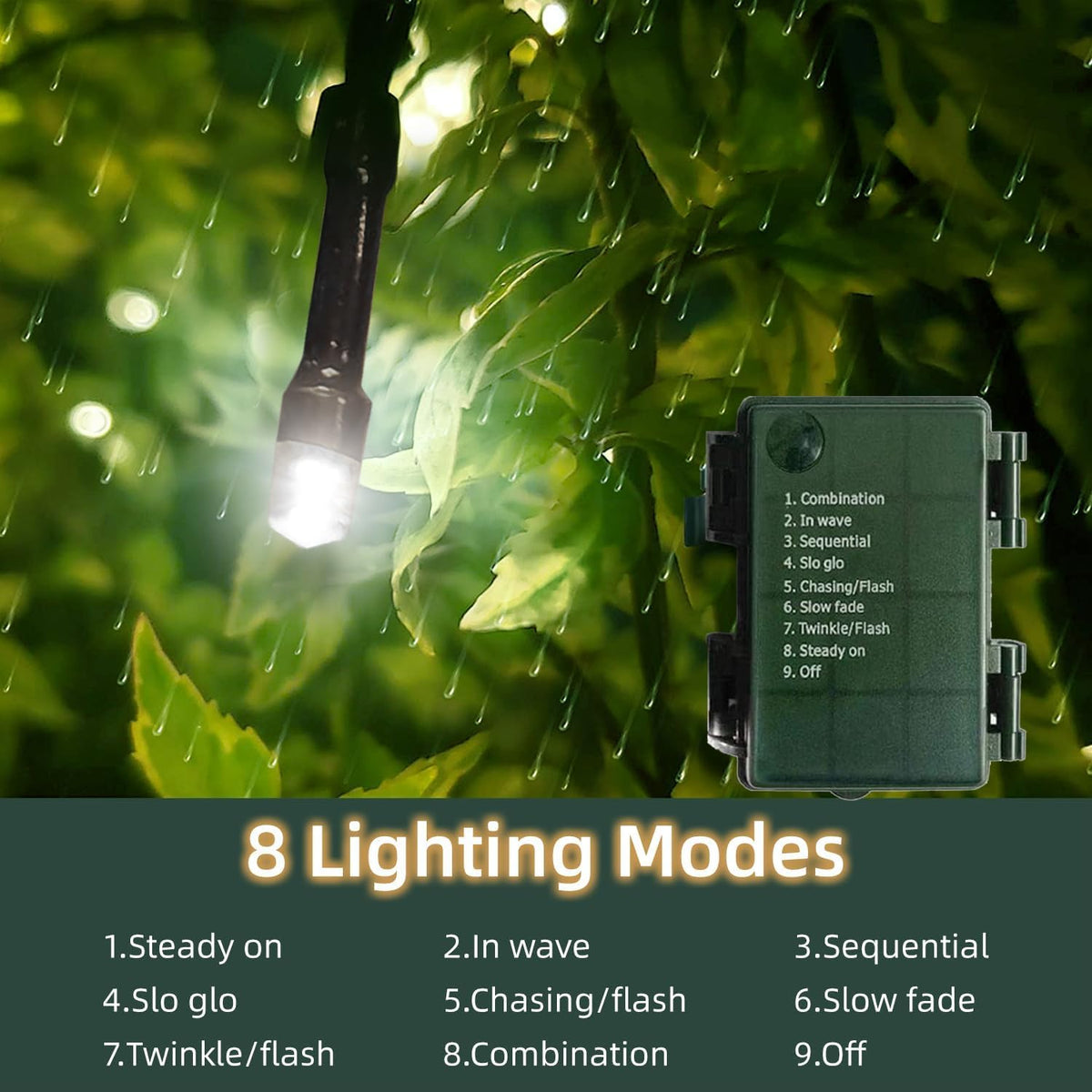 Q: What are the different lighting modes available for these string lights?A: The string lights have 8 different lighting modes including Combination, Wave, Sequential, Slow Glow, Chase/Flash, Slow Fade, Blink/Flash, and Steady On, allowing you to create the perfect atmosphere for any occasion.