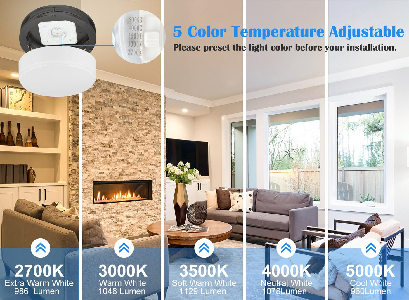 Q: What are the different color temperature options available for the Faymart lighting flush mount ceiling light?A: The Faymart lighting flush mount ceiling light offers 5 color temperature options: 2700K (Extra Warm White), 3000K (Warm White), 3500K (Neutral White), 4000K (Cool White), and 5000K (Daylight). You can easily adjust the color temperature using an internal switch before installation.