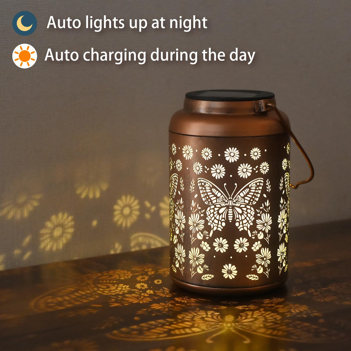Q: What materials are the Butterfly Solar Lanterns made of?A: These lanterns are crafted from upgraded durable metal, ensuring sturdiness and resistance to deformation. The retro design features a gold copper color with a hollow out metal veneer that enhances their aesthetic appeal.