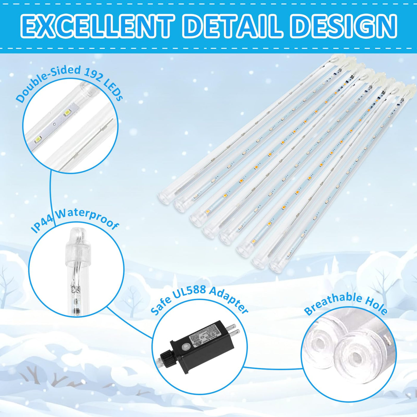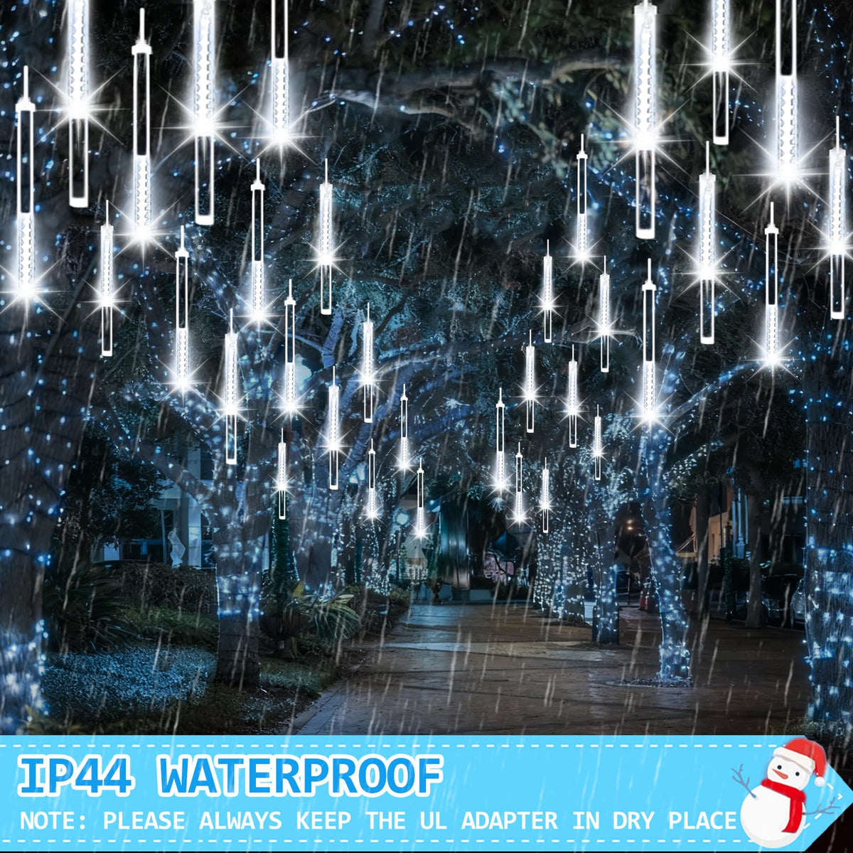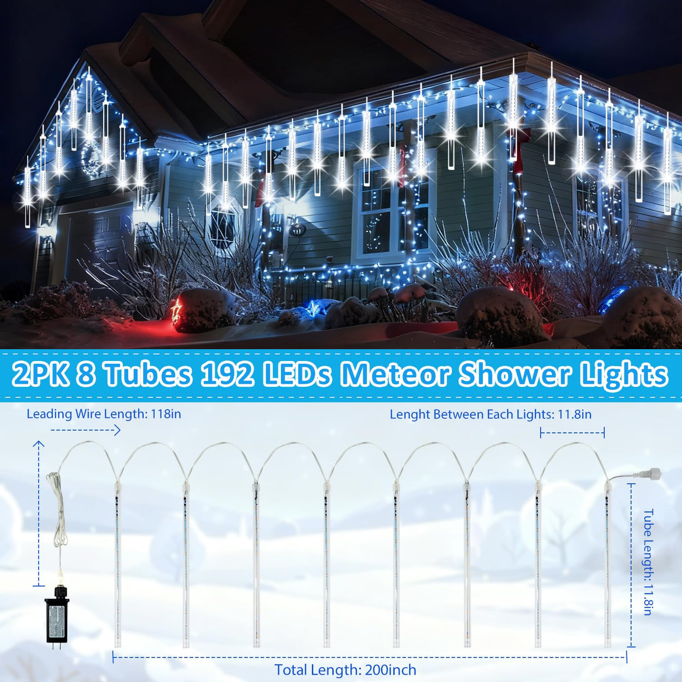 2-Pack Christmas Lights Outdoor 16Tubes 384Leds Extendable Meteor Shower Lights Falling Rain Light Waterproof Plug In Tree Light For Christmas Backyard Garden Patio Xmas Decoration (Cool White)