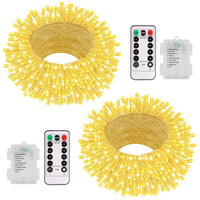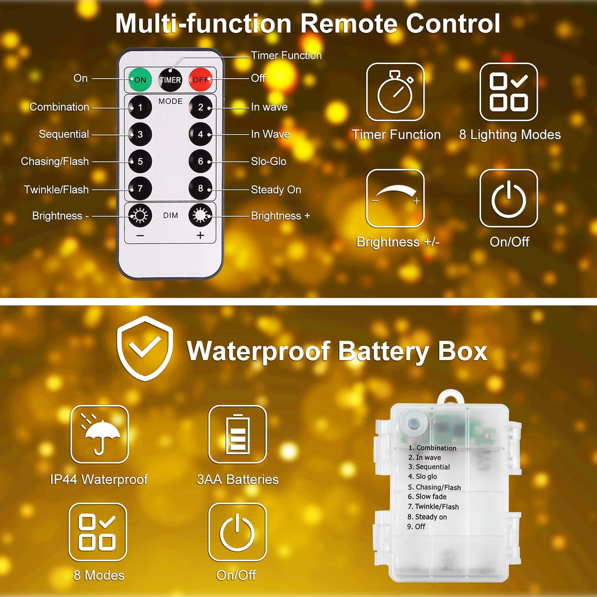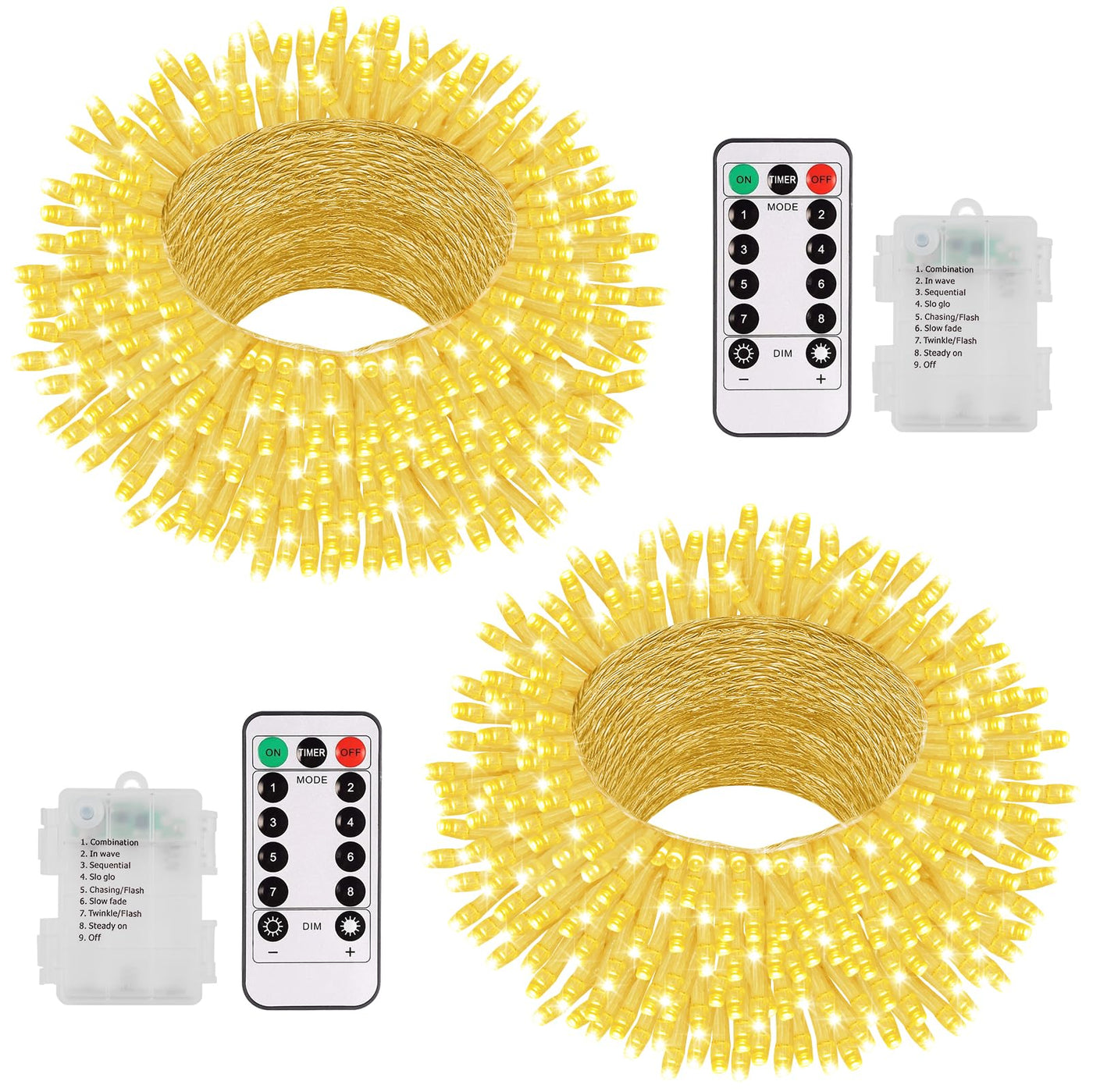2 Pack Battery String Lights 33Ft 100LED Fairy String Lights with Timer Remote 8 Modes Twinkle Lights for Valentine, Easter, Wedding, Christmas, Girls Bedroom, Patio, Indoor Outdoor Decoration Specification: Light Color: Warm White LED Quantity: 2*100 Strip Length: 2*33ft Lead Length: 50cm Waterproof Rate: IP54 Power Source: 3 AA batteries (not supplied) 8 Modes: Combination/ Wave/ Sequence/ Slow/ Chase/ Flashing/ Slow fade/ Flashing/ Flickering/ Steady on Package Content: 2 x 100 LED waterproof battery fairy lights string