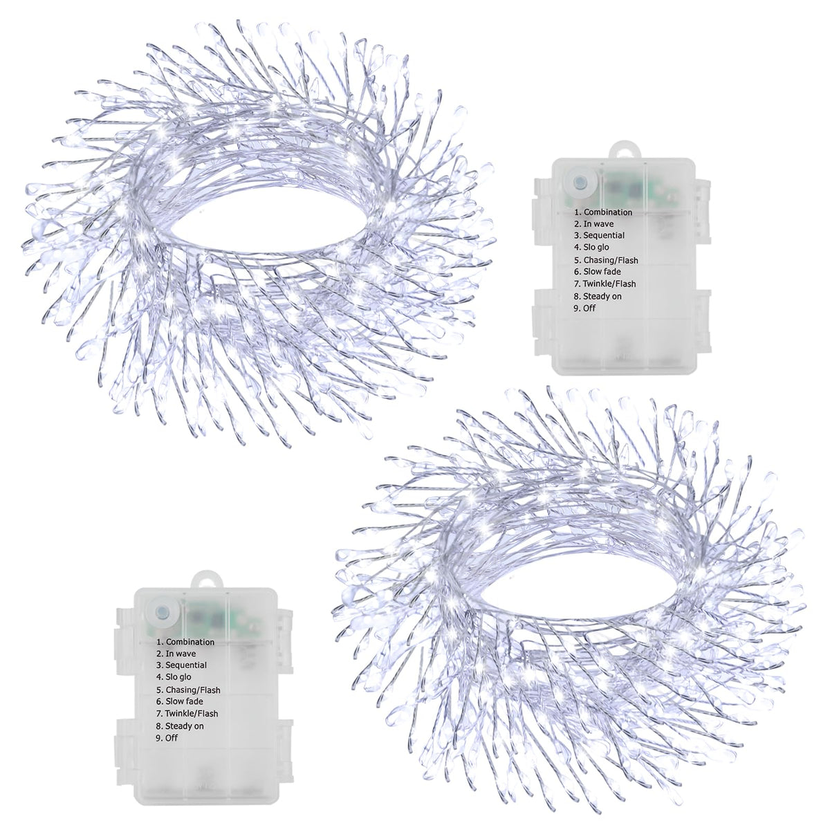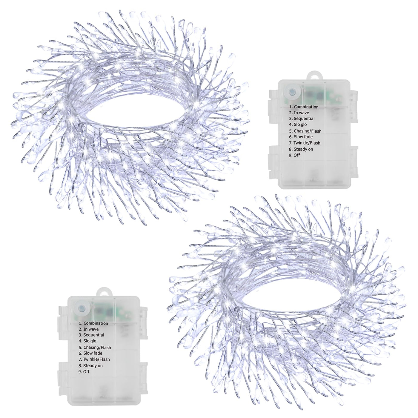 2 Pack Silver Wire Cluster Lights Battery Operated, 10Ft 200 Led Firecracker String Lights, Waterproof Fairy Lights With Timer For Diy Wreath Bedroom Wedding Indoor Outdoor Decorations (Cool White) Sepcifications Brand: Bsglobal Led Quantity: 2 X 200 Led Light Color Options: Cool White Size: 10Ft/3M Per String Lead Wire Length: 1.64Ft Waterproof: Ip54. 8 Light Effect: 1. Combination 2. Steady On 3. Slow Fade 4. In Wave 5. Slo Glo 6. Chasing/ Flash 7. Sequential 8. Twinkle/ Flash Timer Program The Lights Will Turn On In The Automatic Timing Sequence Of 6 Hours On, 18 Hours Off Over Each 24 Hour Period. Really Safe Battery Operated String Lights For Indoor And Outdoor You Can Be Rest Assured That These Fairy Lights Are Super Safe For Use Around Fabrics, Furnishings And Little Fingers! Wide Application: Perfect For Christmas Trees, Holiday Seasons, Wreaths, Bushes, Trunk, Bedroom, Living Room, Bookcase, Upstairs Railing, Balcony, Door, Porch, Gazebo, Garden, Patios, Backyard, Fences, Deck, Hanging Baskets, Birthday Party, Weddings, Camping, Indoor And Outdoor Decorations. Package Content: 2 X Fairy Lights