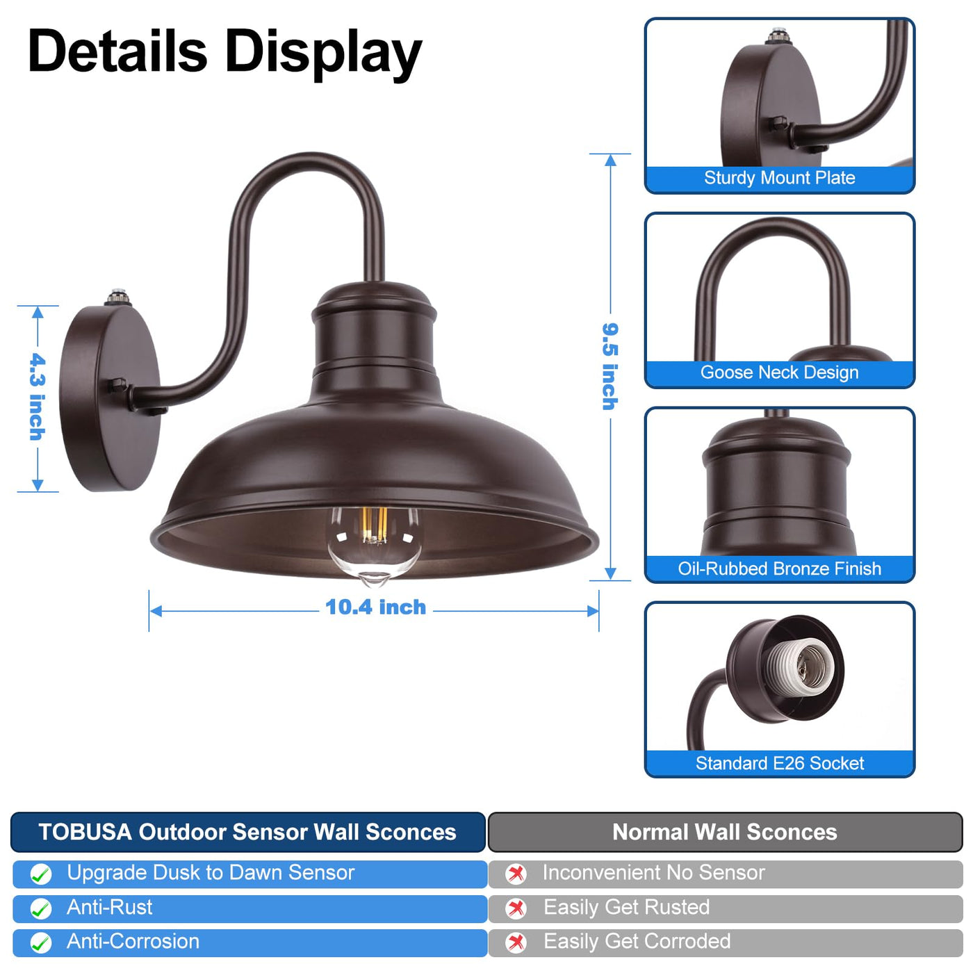 Tobusa 2-Pack Oil-Rubbed Bronze Outdoor Dusk To Dawn Barn Lightswhy You Choose Our Farmhouse Outdoor Lighting?Practical & Sensitive Sensoradopted With Advanced Dusk To Dawn Sensor, Our Dusk To Dawn Outdoor Lighting Will Detect The Surrounding Brightness Sensitively, Auto-On At Dusk & Auto-Off At Dawn.Gooseneck Barn Light Designdesigned With Classic Oil Rubbed Bronze Finish Frame And Special Gooseneck Design, These Farmhouse Exterior Light Fixtures Has A Premium Texture And Emit Beautiful And Charming Lighting With Its Unique Design, Definitely The Brilliant Complement For Any Home Decorweather-Resistance & Last For Yearstobusa Outdoor Wall Sconces Are Waterproof With Its Heavy-Duty Metal Surface, Being Waterproof And Ready For All Weathers, Rain Or Snow, Ultra High Or Low Temperatures.Get These Brilliant Outdoor Wall Lights Now!