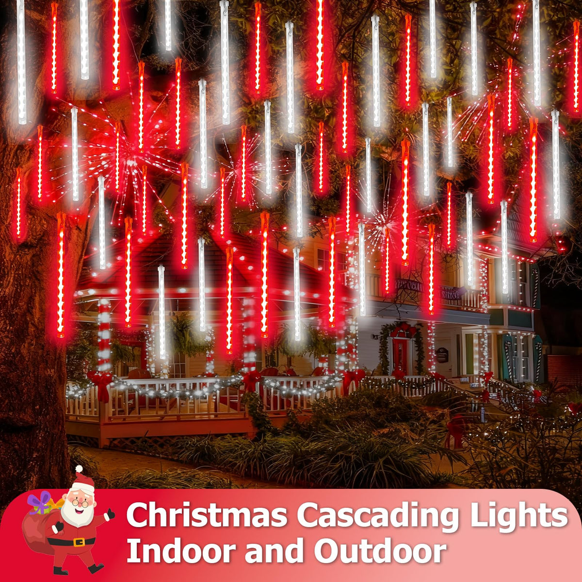 2-Pack Extendable Meteor Shower Christmas Lights Outdoor 16 Tubes 384 Leds Plug In String Light For Christmas Decorations Outdoor Tree Decor Patio Holiday (Red And White)