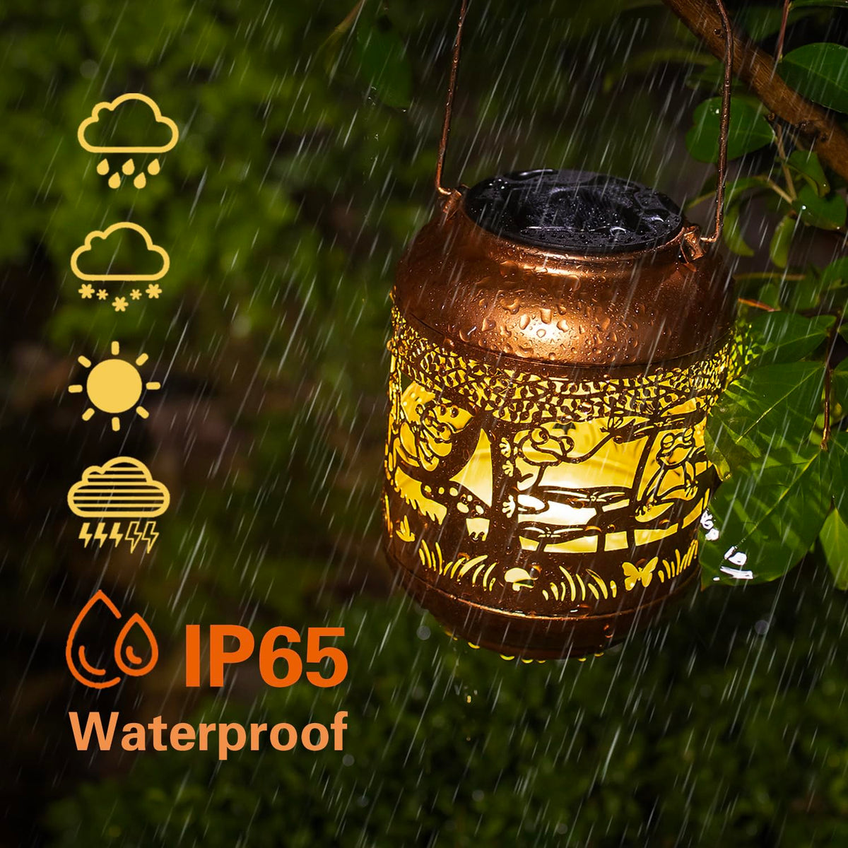Q: Is the Frog Solar Lantern waterproof?A: Yes, the Frog Solar Lantern has an IP65 waterproof rating, making it suitable for various weather conditions including rain and snow.