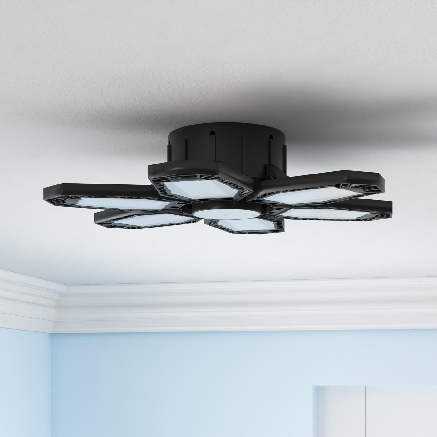 Q: How do the adjustable panels work for lighting?A: The adjustable panels on the LED garage lights can be tilted from 0° to 90°, allowing you to direct light exactly where you need it. This unique design enables you to focus the illumination on specific areas or corners in your workspace for enhanced visibility.