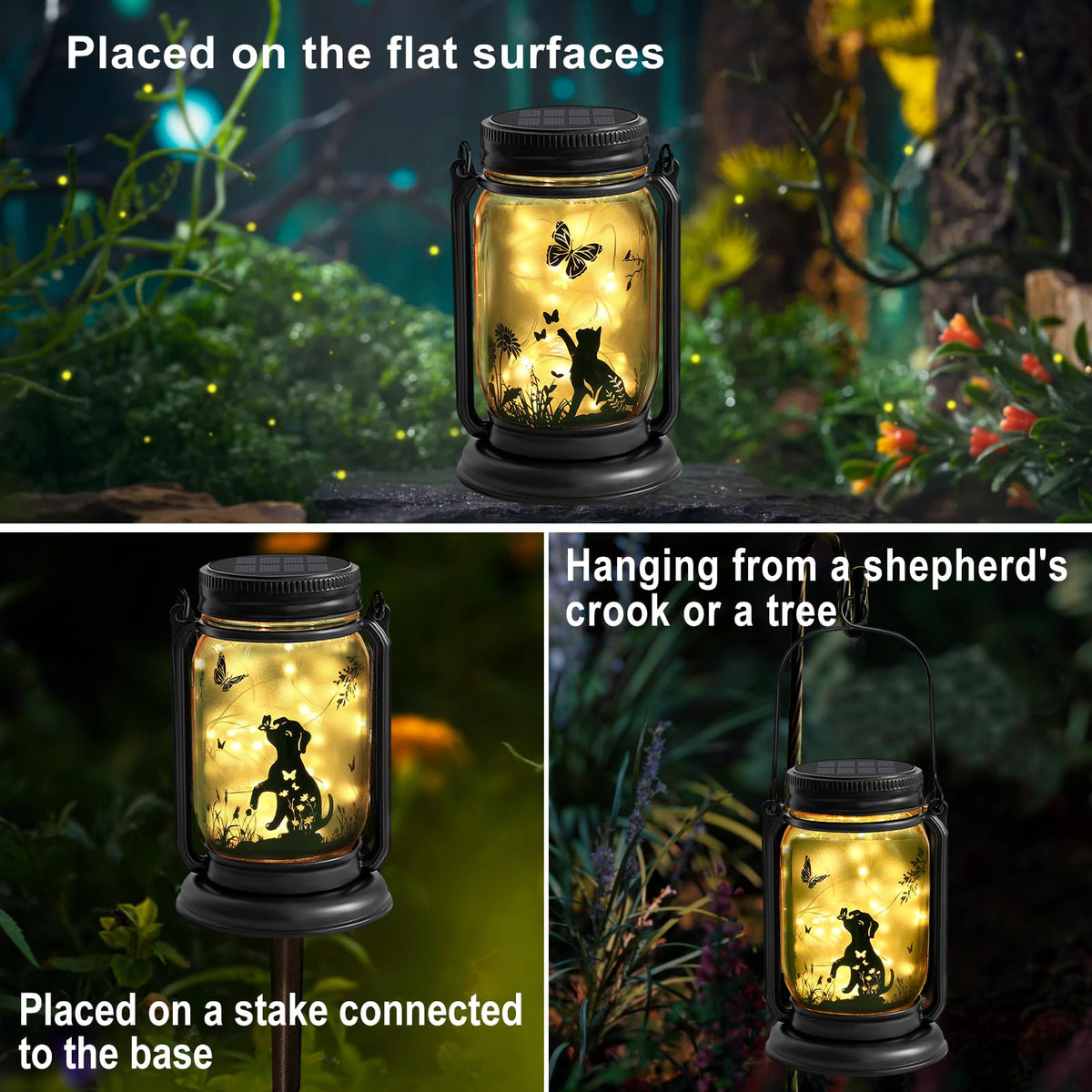 2 Pack Outdoor Hanging Solar Lantern, Cat & Dog Butterfly Theme Vintage Glass Mason Jar Solar Fairy Lights, Gifts For Mom, Grand