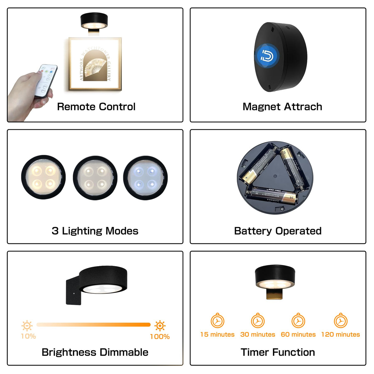 Auto OFF Timer: Enjoy peace of mind with the built-in timer function on the remote. Set the picture light to turn off automatically in 15, 30, 60, or 120 minutes, conserving battery life and preventing unnecessary energy use.
