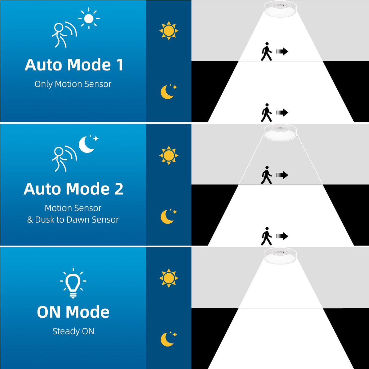 Q: What are the different operating modes available for this ceiling light?A: The ceiling light features three operating modes: Auto Mode 1, where it turns on during the day upon detecting motion; Auto Mode 2, which activates only at night; and Manual Mode, allowing you to control the light manually.