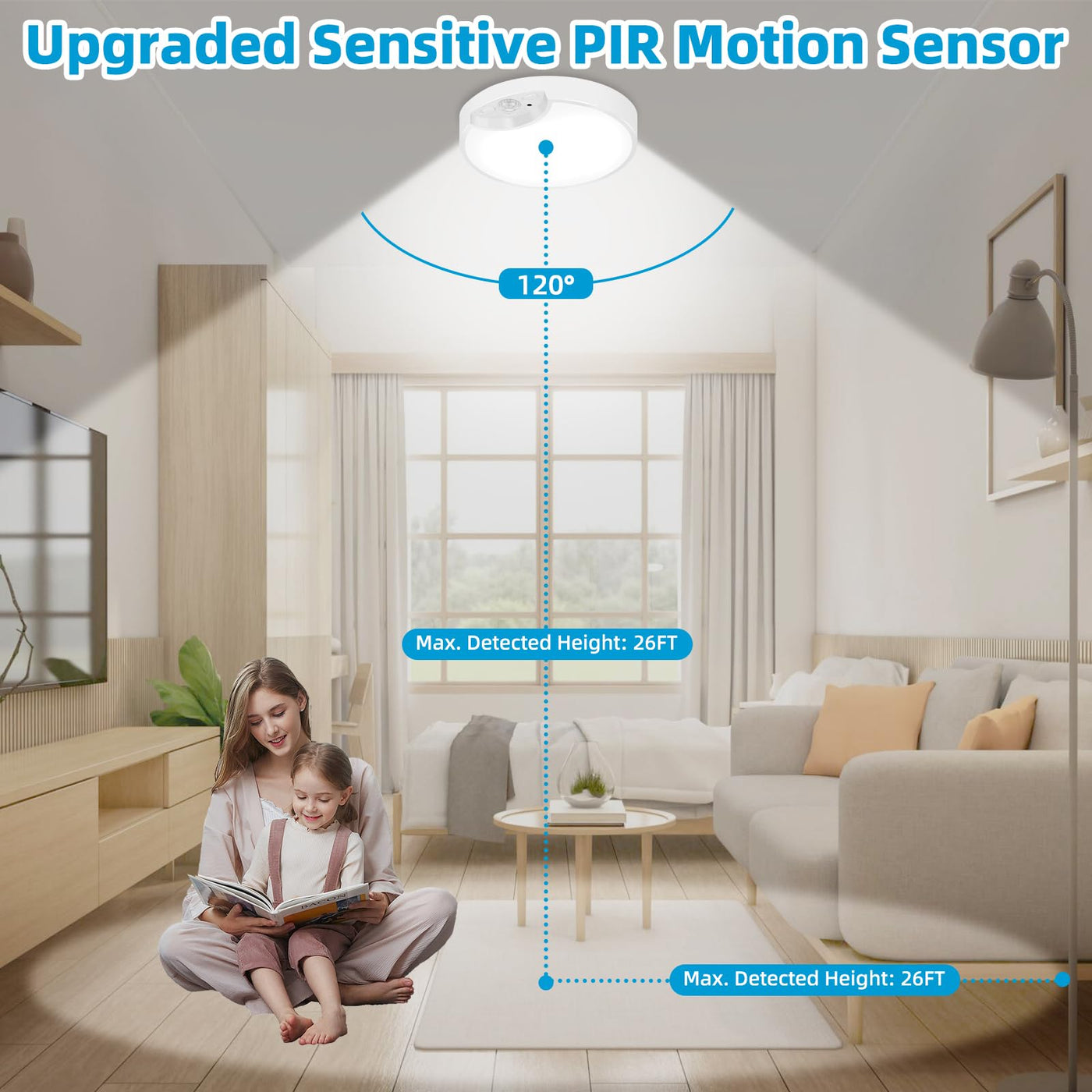 Q: How does the PIR motion sensor work in the ceiling light?A: The PIR motion sensor in the ceiling light detects movement within a wide range of 120° and up to 26 feet away. It automatically turns on the light when it senses motion, ensuring safety and convenience in areas like hallways or closets.