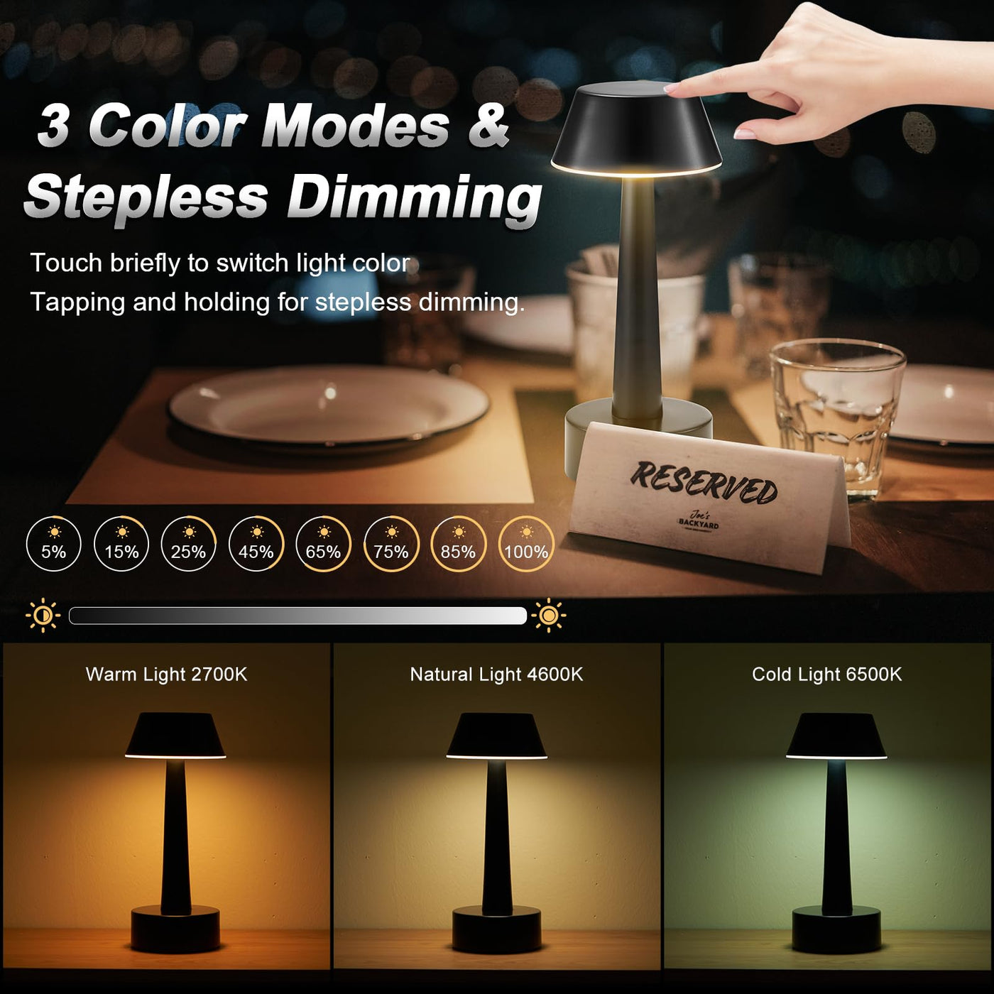These Small Portable Rechargeable Table Lamps Can Used As Restaurant Table Lamps, Bar Table Lamps, Dinner Table Lamps, Dinning Table Lamps, Bedside Touch Table Lamps, Coffee Table Lamps Features: Brand: Intelive Material: Metal Aluminum Color Temperature: Warm Color (2700K), Natural Light (4600K), Cold Light (6500K), Stepless Brightness Adjustable Finish: Matte Lacquered Work Time: Up To 48 Hours (Depending On The Brightness Setting Used) Power Supply: Rechargeable 2000Mah Battery Charging Time: About 4 Hours Charging Port: Usb Type-C Charging Port Color: Black Top Shade Diameter: 2.72'' / 6.9Cm Base Diameter: 3.42'' / 8.7Cm Height: 8.89'' / 22.6Cm Gorgeous Shape And Fantastic Color, Nice Addition For Home Decoration Portable And Lightweight, Easy To Carry Out, A Nice Cordless Light For Camping And Outdoor Party Multifunction: Small Nightstand Light For Nursery Use In Midnight Application: Living Room, Dining Room, Bedroom, Study Room, Office, Game Table, Coffee Table, Dining Table, Restaurant, Bar, Caf , Hotel Guest Room, Dorm, Reading Area, Garden, Patio, Lanai, Porch, Rvs, Outdoor Camping Tent Package Include: 2 X Cordless Led Table Lamps 2 X Type-C Usb Charging Cables 2 X Ul Listed Adapters