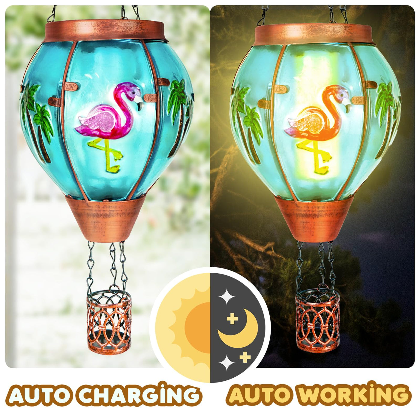 Q: How do the solar lights work?A: The flamingo hot air balloon solar lights are powered by solar energy. During the day, the solar panel collects sunlight and converts it into electricity, which is stored in the battery. At night, the lights automatically turn on, creating a beautiful flickering flame effect.
