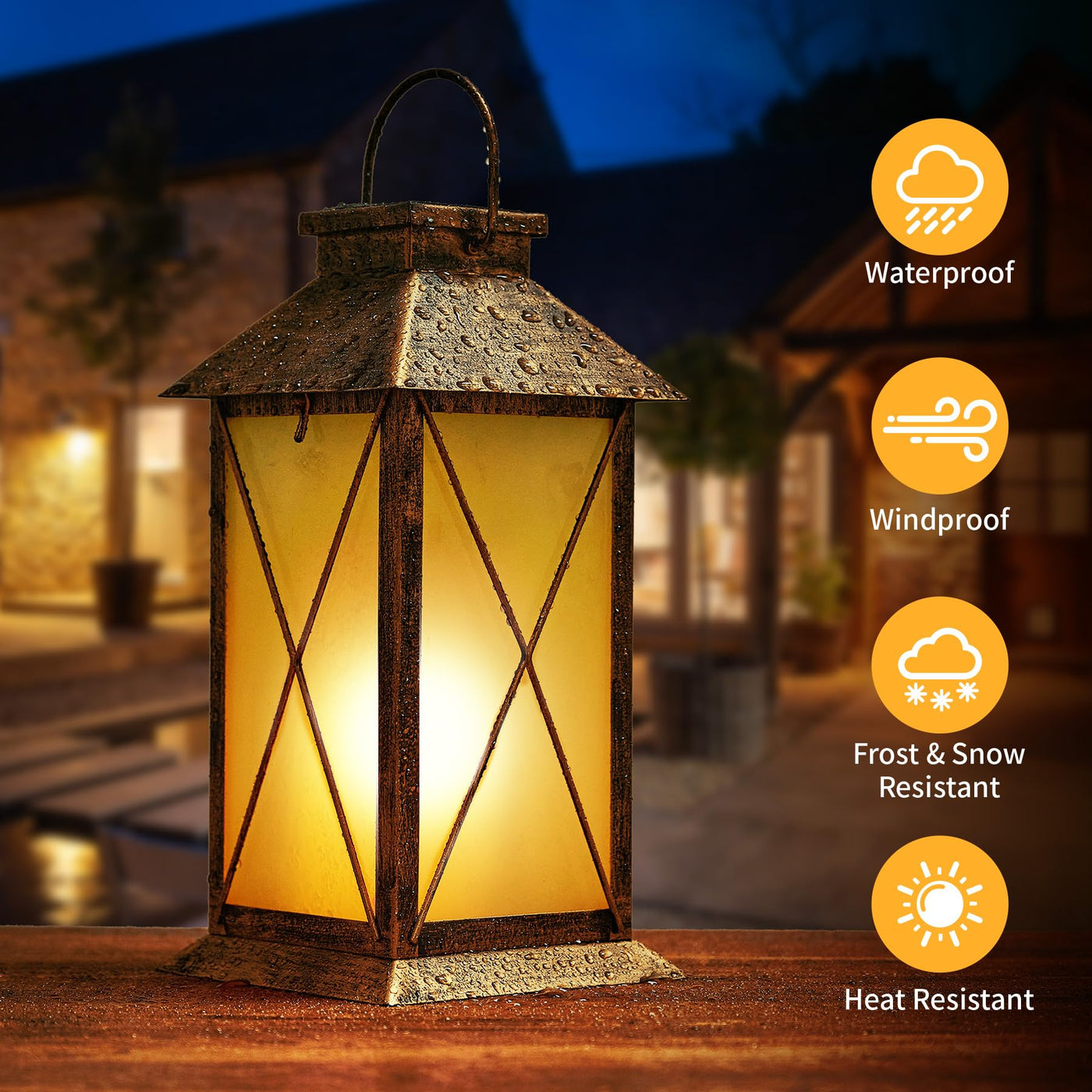 Illuminate your outdoor spaces with the timeless beauty of our 2 Pack Solar Lanterns with Flickering Flame Candle-where elegance meets innovation. These 13 glass hanging lanterns are expertly crafted to elevate your patio, garden, or yard with the warm, welcoming glow of realistic candlelight. Realistic Flickering Flame Candle Glow Enjoy the cozy, mesmerizing ambiance of a real candle-without any worries about open flames or wax mess. Featuring advanced LED technology, each lantern creates a soft, flickering flame effect that transforms your outdoor evenings into peaceful and inviting gatherings. Durable, Weather-Resistant Construction Built to last, our solar lanterns combine a robust metal frame with tempered glass panels and a sophisticated bronze-cross design. These lanterns are waterproof and corrosion-resistant, ensuring year-round brilliance and beauty even in rain, snow, or summer heat. Efficient Solar Power, All-Night Lighting Harness the suns energy for effortless, eco-friendly illumination. The upgraded solar panels fully charge in just 6 hours of sunlight, providing 8-10 hours of continuous glow after dusk. Automatically recharging by day and lighting up at night, these lanterns help reduce energy bills and environmental impact. Versatile Outdoor & Tabletop Decor Adaptable for any outdoor setting, these solar lanterns are perfect for hanging on shepherd hooks, displaying on tables, lining garden pathways, or accenting your patio and yard. Their elegant design suits any style-whether youre hosting a party, enjoying family time, or relaxing solo. Simple to Use & Low Maintenance A straightforward on/off switch and minimal upkeep mean you spend less time worrying and more time enjoying your lights. Just keep the solar panels clean for optimal performance, and delight in the effortless charm these lanterns bring to your outdoor decor. These beautiful lanterns also make an ideal gift for Mothers Day, birthdays, housewarmings, or special occasions-perfect for moms, grandmas, or anyone who appreciates the harmony of style, sustainability, and function.
