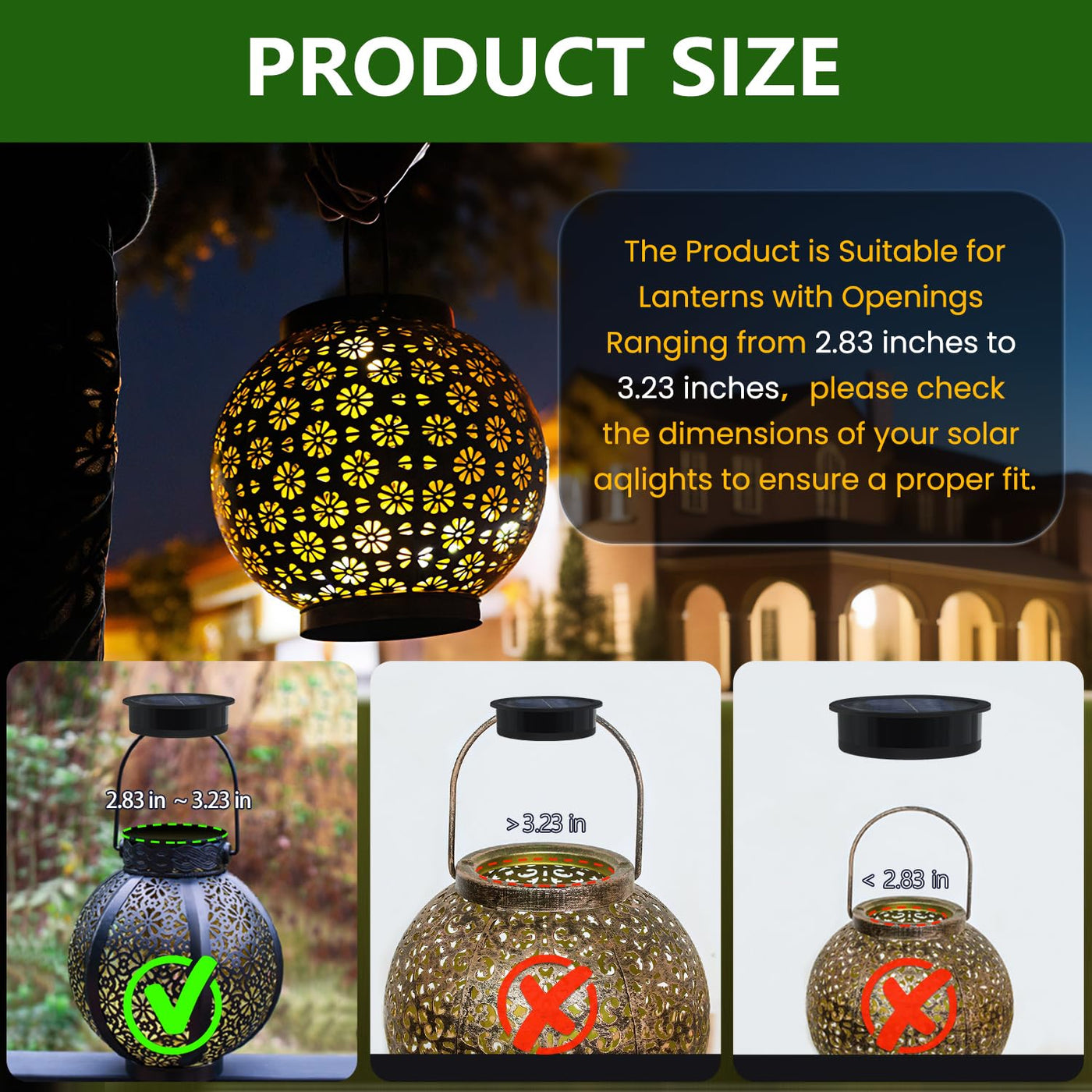 Q: What sizes do the solar light replacement tops fit?A: These solar light replacement tops are designed to fit lantern openings ranging from 2.83 to 3.23 inches, making them compatible with a variety of outdoor lanterns.