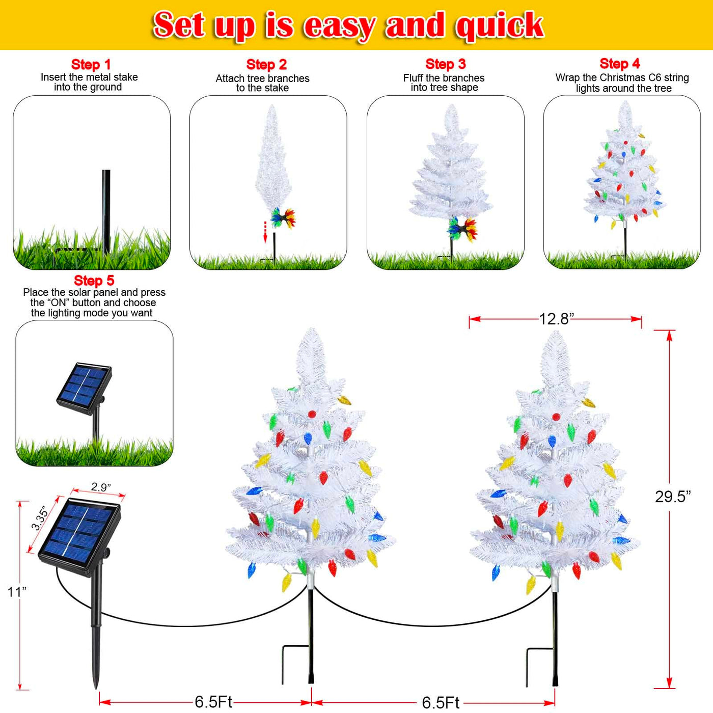 Q: Are the Christmas trees easy to set up and maintain?A: Yes, these trees are designed for easy setup. Simply insert them into the ground, fluff the branches, wrap the lights around, and turn on the switch. No electrical outlet is required.